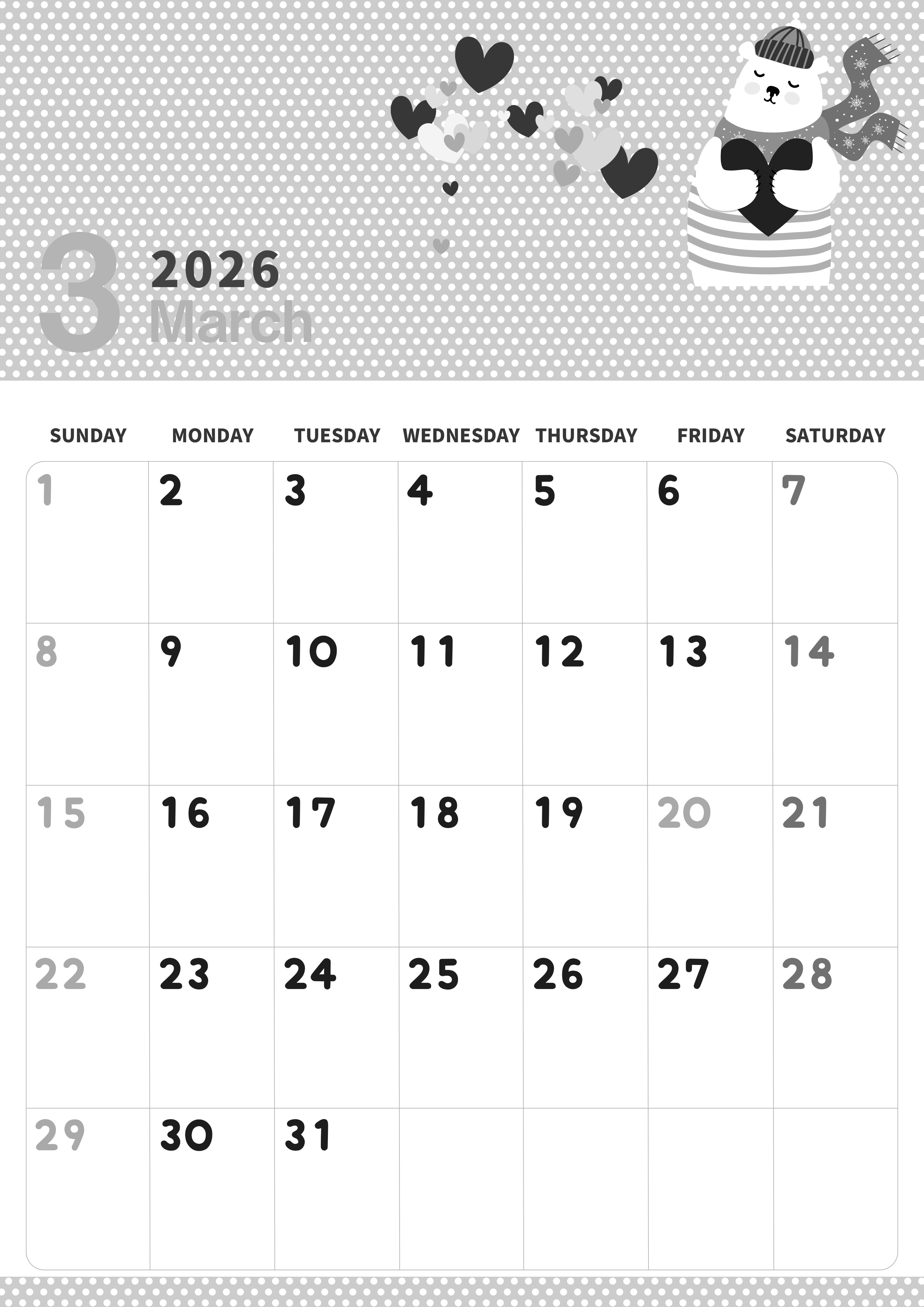 2026年・無料のカレンダーテンプレート 2026年3月縦型モノクロの日曜始まり 白熊イラストのおしゃれA4無料白黒カレンダー(2026-00320310) 素材状デザイン王 2025年4月1日 2026年3月縦型モノクロの日曜始まりの無料テンプレート白黒カレンダーです。パッと目に飛び込んでくるかわいいハッピーな白黒カレンダーです。縦型なので壁に貼って使うのに適しているフリー素材です。(2026-00320310) 3月 縦型のカレンダー 日曜始まり 白黒 カレンダーデザイン-0032