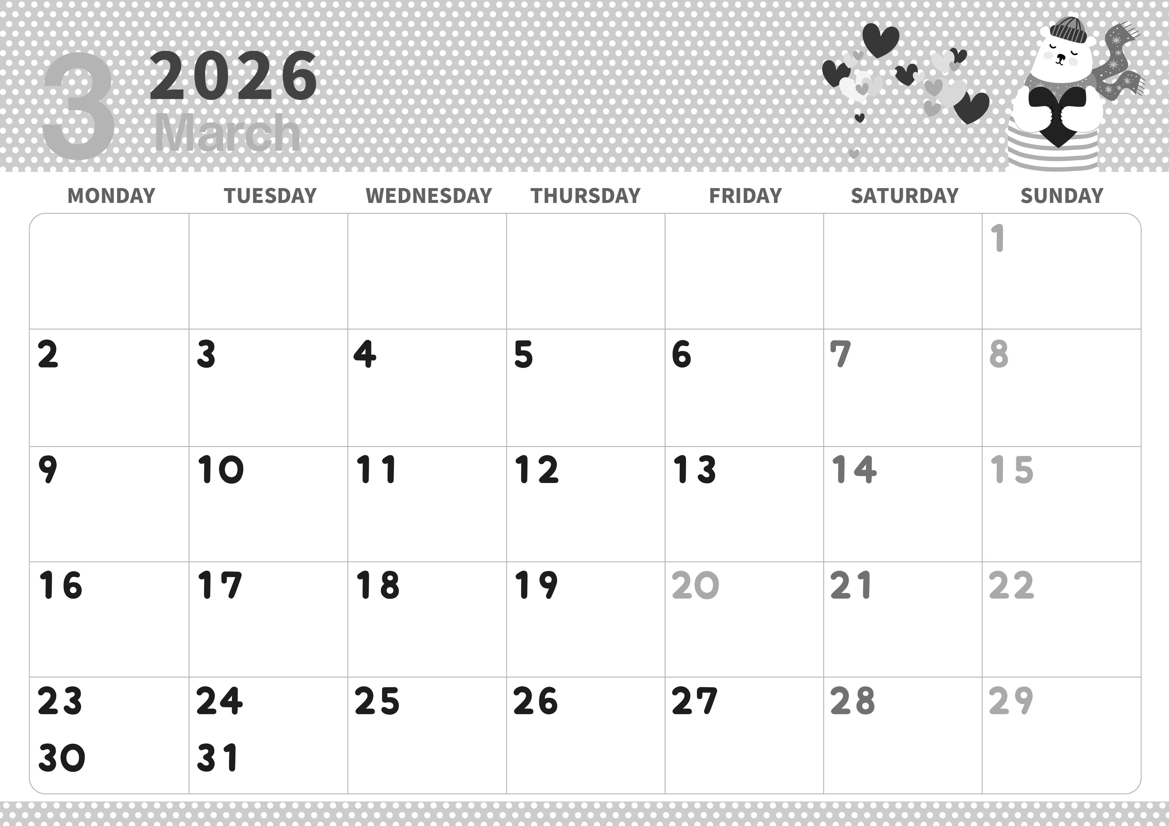 2026年3月横型モノクロの月曜始まりの無料テンプレート白黒カレンダーです。シマシマデザインの洋服を着た白熊がおしゃれなイラスト付き白黒カレンダーはダウンロードを無料で行えます。月曜始まりで使いやすいです。(2026-00320301)