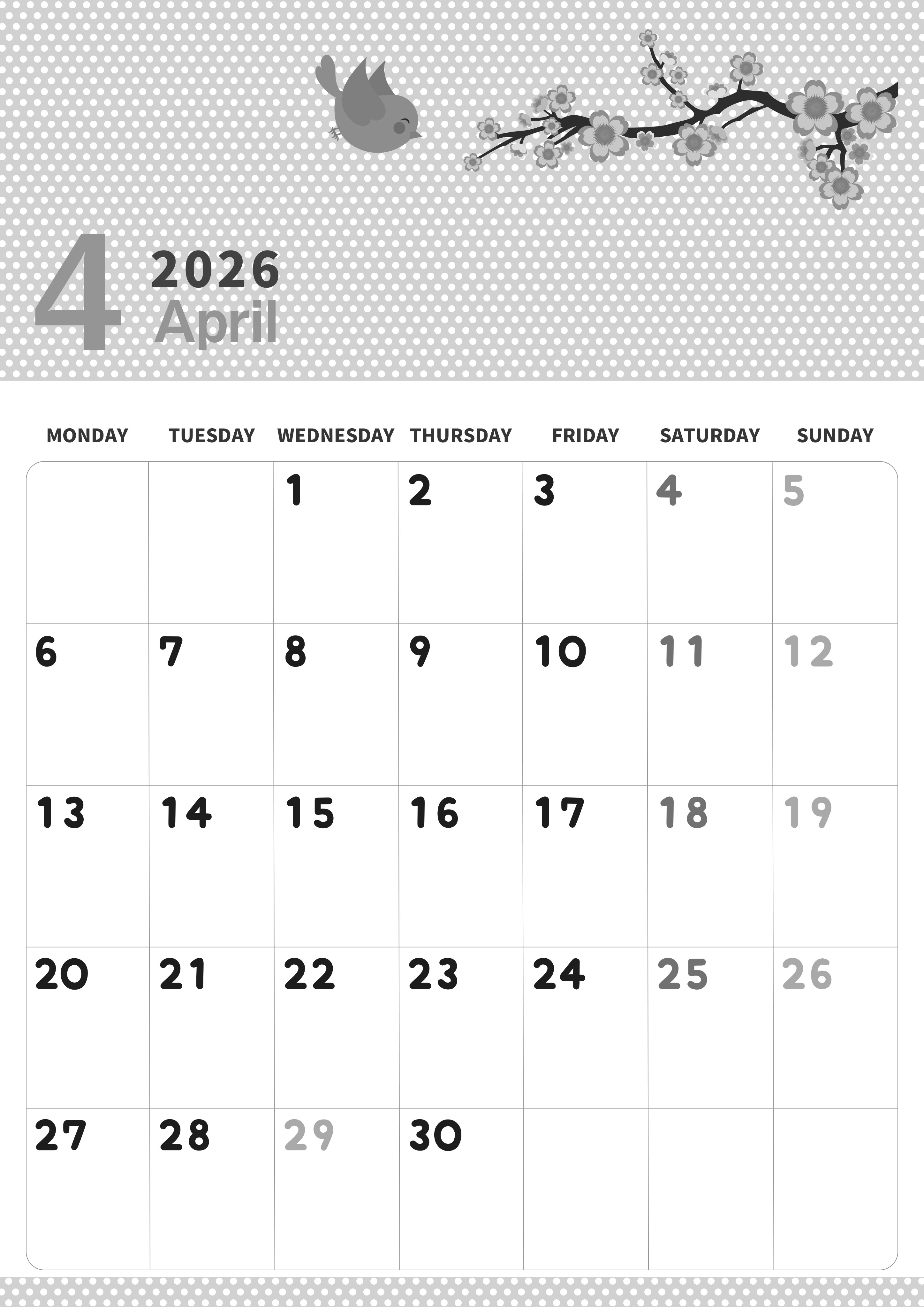 2026年・無料のカレンダーテンプレート 2026年4月縦型モノクロの月曜始まり ウグイスイラストのおしゃれA4無料白黒カレンダー(2026-00320411) 素材状デザイン王 2025年4月1日 2026年4月縦型モノクロの月曜始まりの無料テンプレート白黒カレンダーです。ウグイスのイラストが愛らしくかわいい白黒カレンダーです。縦型でたっぷりとスケジュールを書き込める有用なフリー素材です。(2026-00320411) 4月 縦型のカレンダー 月曜始まり 白黒 カレンダーデザイン-0032