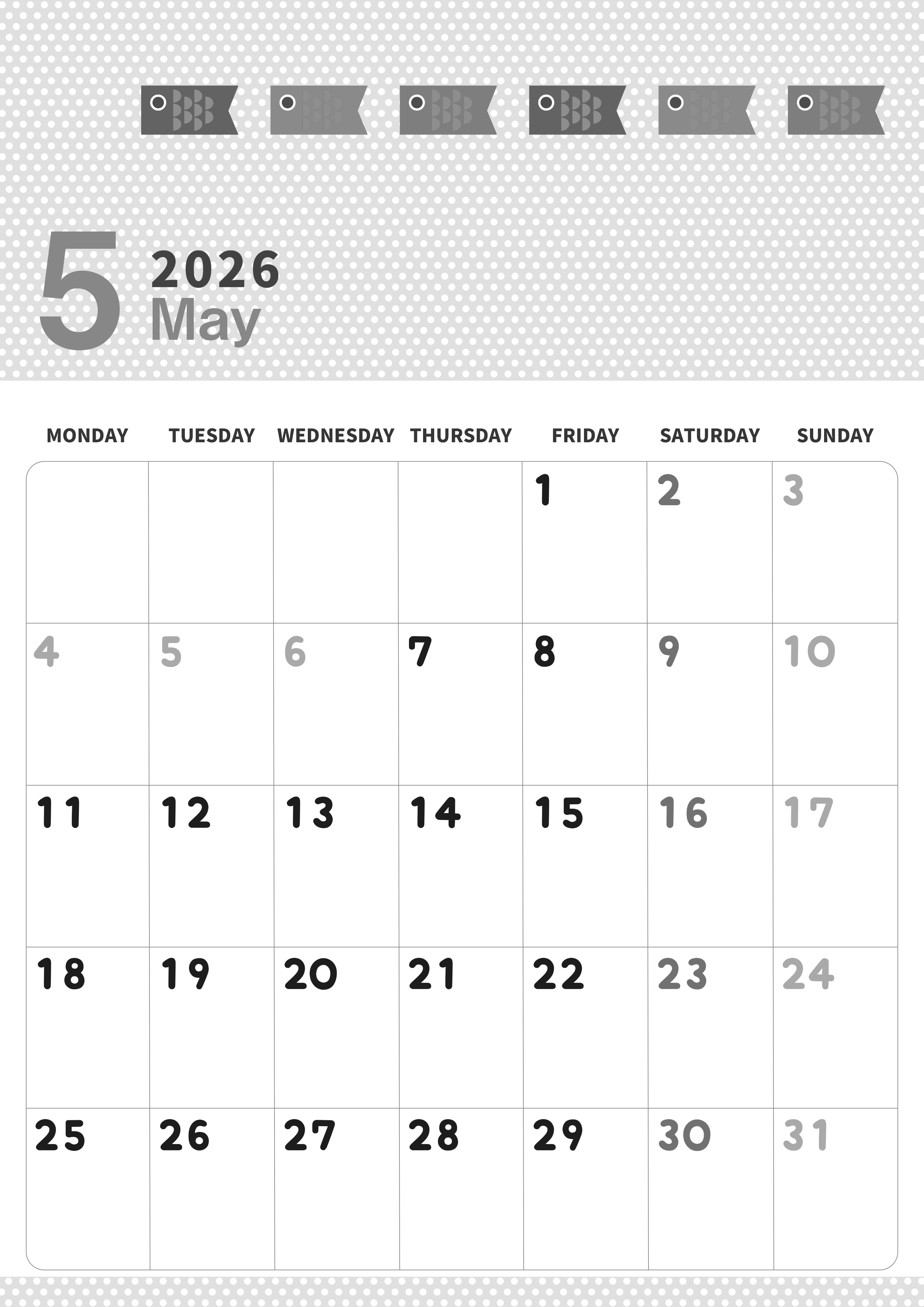 2026年5月縦型モノクロの月曜始まりの無料テンプレート白黒カレンダーです。白のドットの背景に鯉のぼりのイラストがぽんぽんと並んでいる様子が子供の日らしいかわいい便利で行事を把握出来る月曜始まり白黒カレンダーです。(2026-00320511)