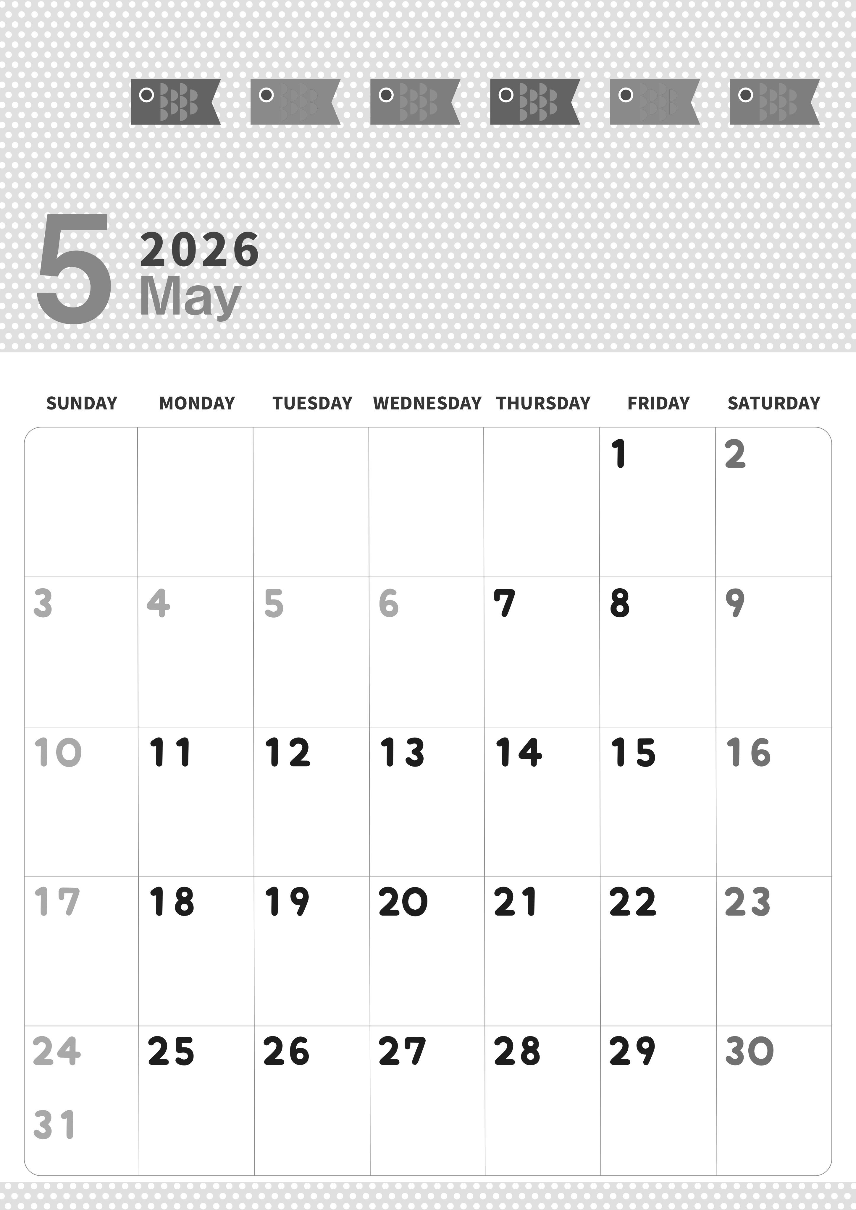2026年5月縦型モノクロの日曜始まりの無料テンプレート白黒カレンダーです。子供の日といえば鯉のぼりです。鯉のぼりのイラストがかわいいデザインです。曜日によってフォントの色分けがされているので見やすい白黒カレンダーとなっています。(2026-00320510)