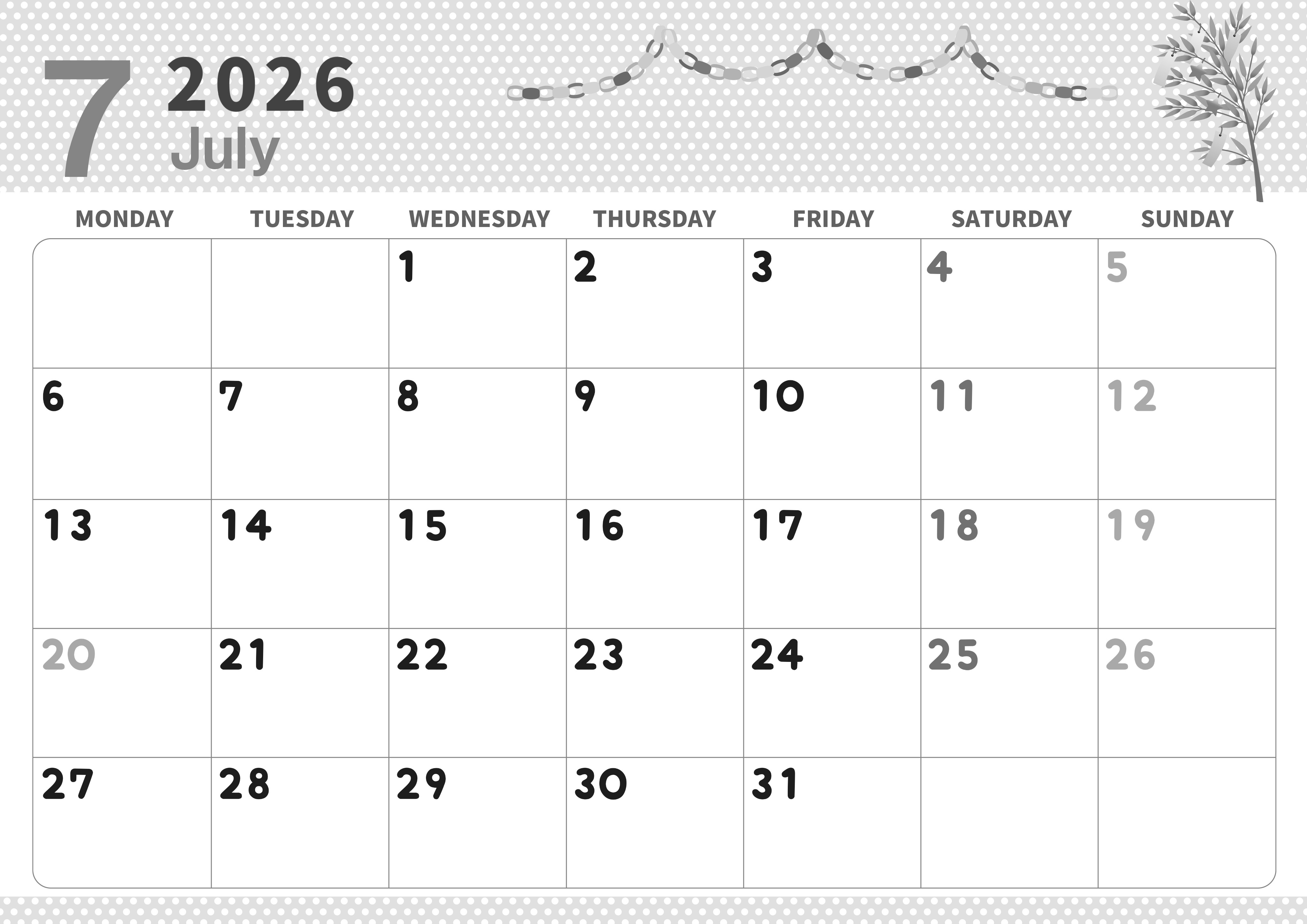 2026年7月横型モノクロの月曜始まりの無料テンプレート白黒カレンダーです。月曜始まり白黒カレンダーを求めているのであればダウンロードを推奨します。輪飾りのイラストが上部に施されていて全体的にシンプルでありながらもかわいいです。(2026-00320701)