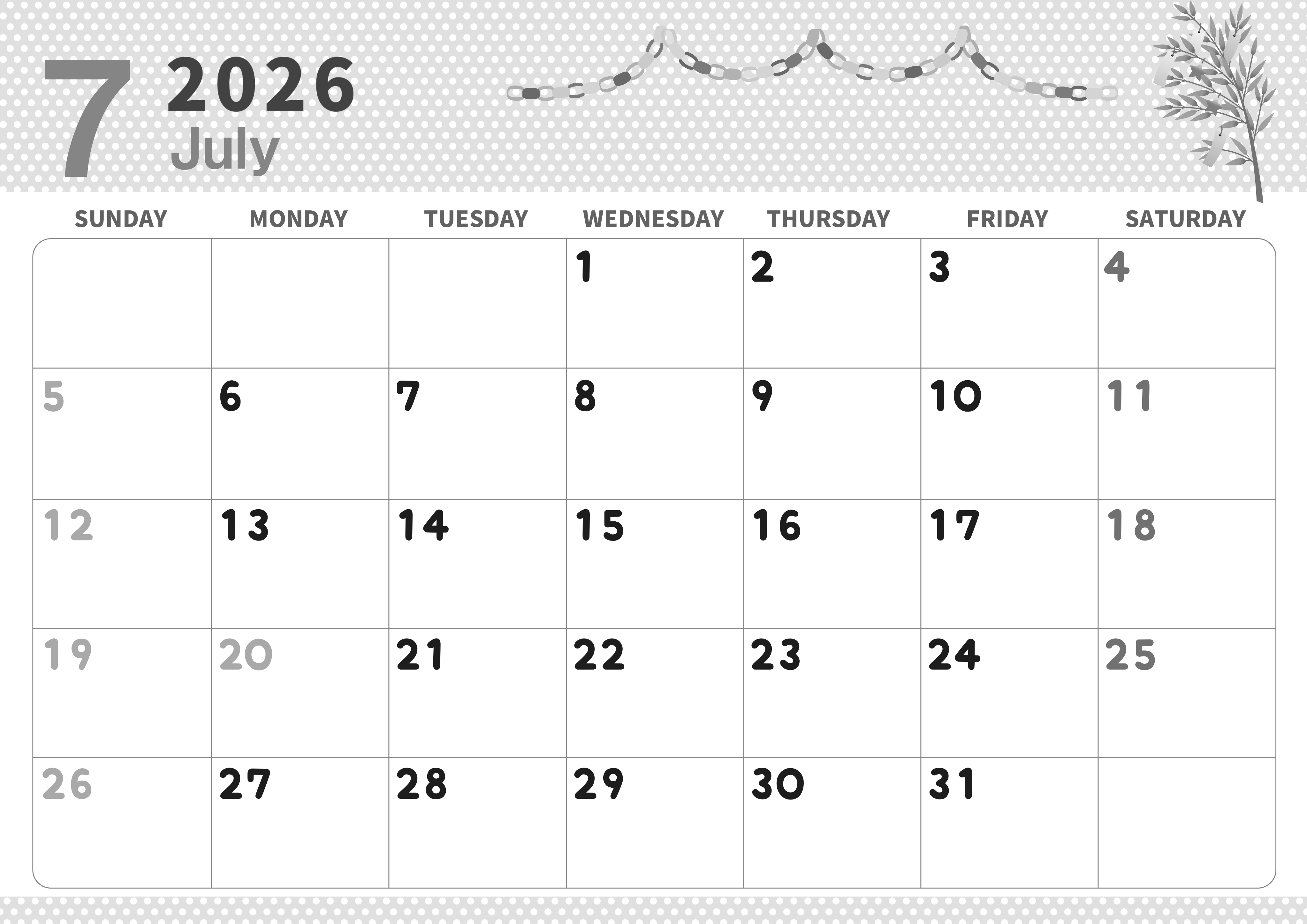 2026年7月横型モノクロの日曜始まりの無料テンプレート白黒カレンダーです。七夕の飾りとして大活躍する折り紙で作られている輪飾りのイラストが小さくてかわいい白黒カレンダーです。実用性の高いフォーマットかつ無料です。(2026-00320700)