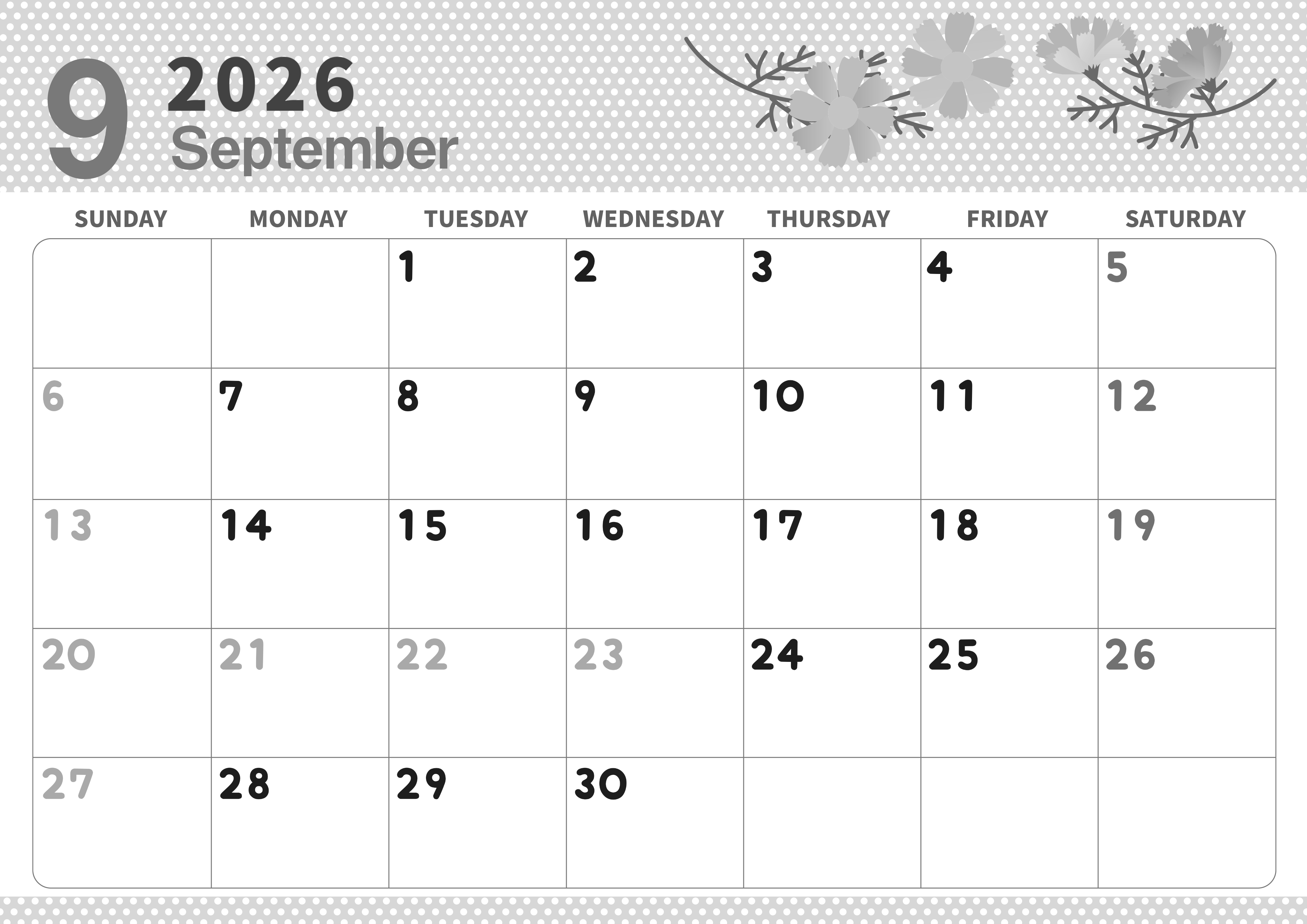 2026年・無料のカレンダーテンプレート 2026年9月横型モノクロの日曜始まり コスモスがおしゃれなイラスト白黒カレンダー(2026-00320900) 素材状デザイン王 2025年4月1日 2026年9月横型モノクロの日曜始まりの無料テンプレート白黒カレンダーです。白ドットをあしらった背景にコスモスを4輪描いているおしゃれで上品なイラストがおすすめ要素の白黒カレンダー素材です。(2026-00320900) 9月 横型のカレンダー 日曜始まり 白黒 カレンダーデザイン-0032