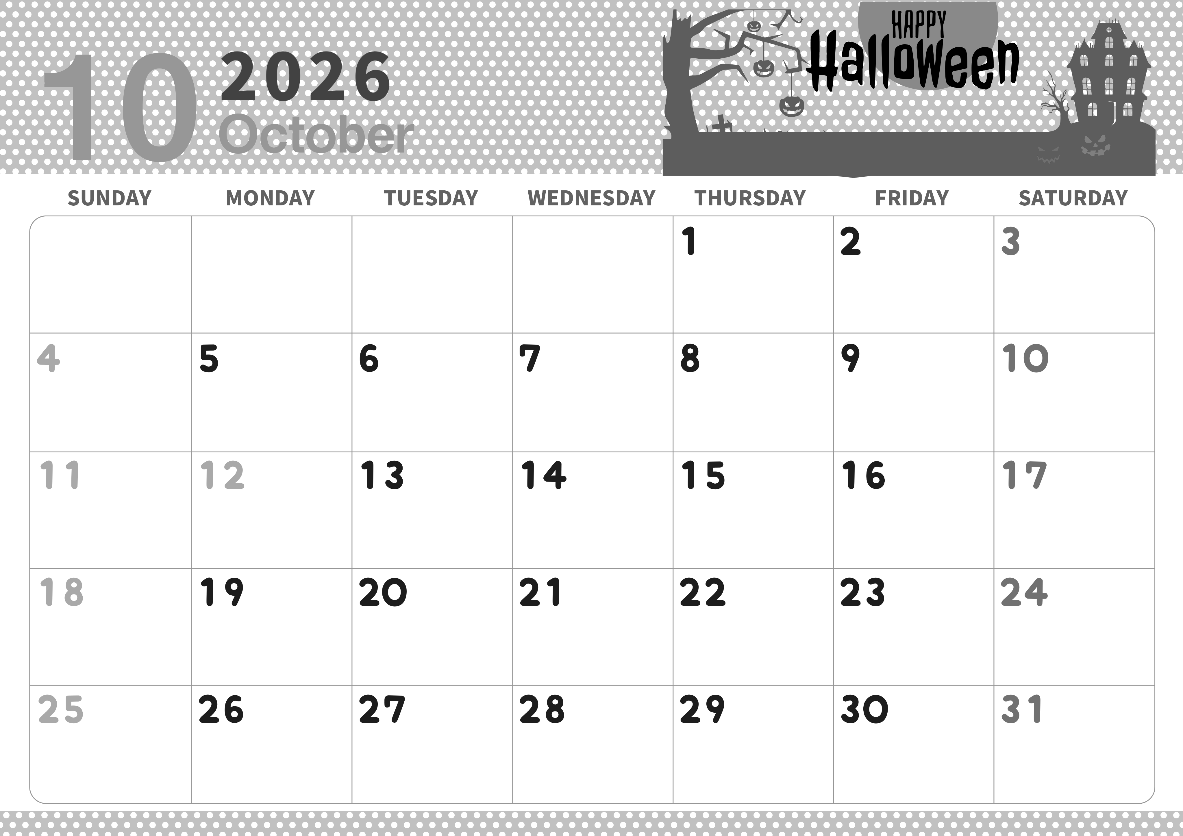 2026年10月横型モノクロの日曜始まりの無料テンプレート白黒カレンダーです。ハロウィンのロゴがお化け屋敷な雰囲気をゴリゴリに漂わせているイラストです。ちょっと怖いですがおしゃれさもあるのでバランスが取れています。(2026-00321000)