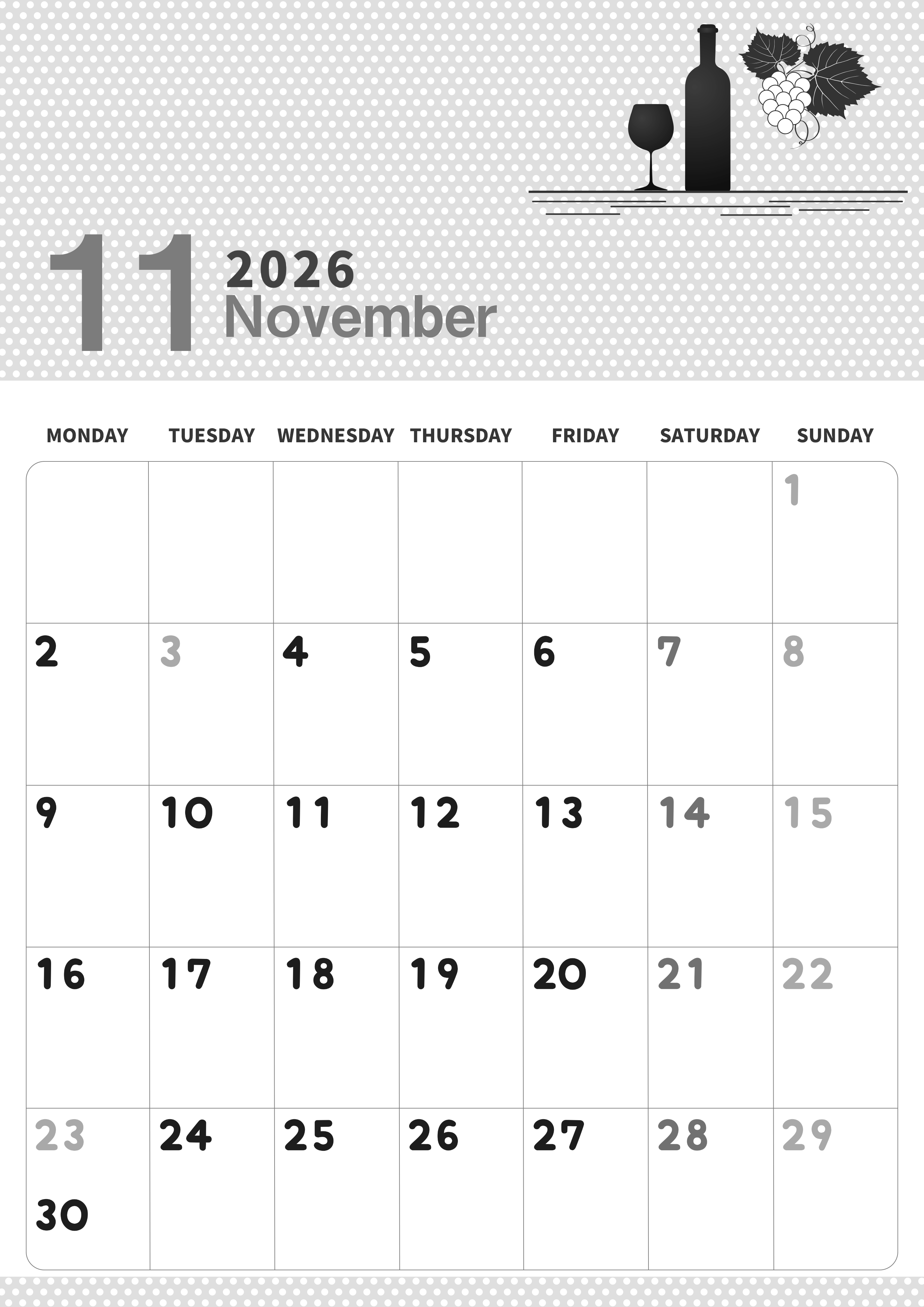 2026年11月縦型モノクロの月曜始まりの無料テンプレート白黒カレンダーです。ワインボトルのイラストがすっきりしています。おしゃれな雰囲気だけでなく月曜始まりで曜日によって文字の色分けがされているので実用性が高いです。(2026-00321111)