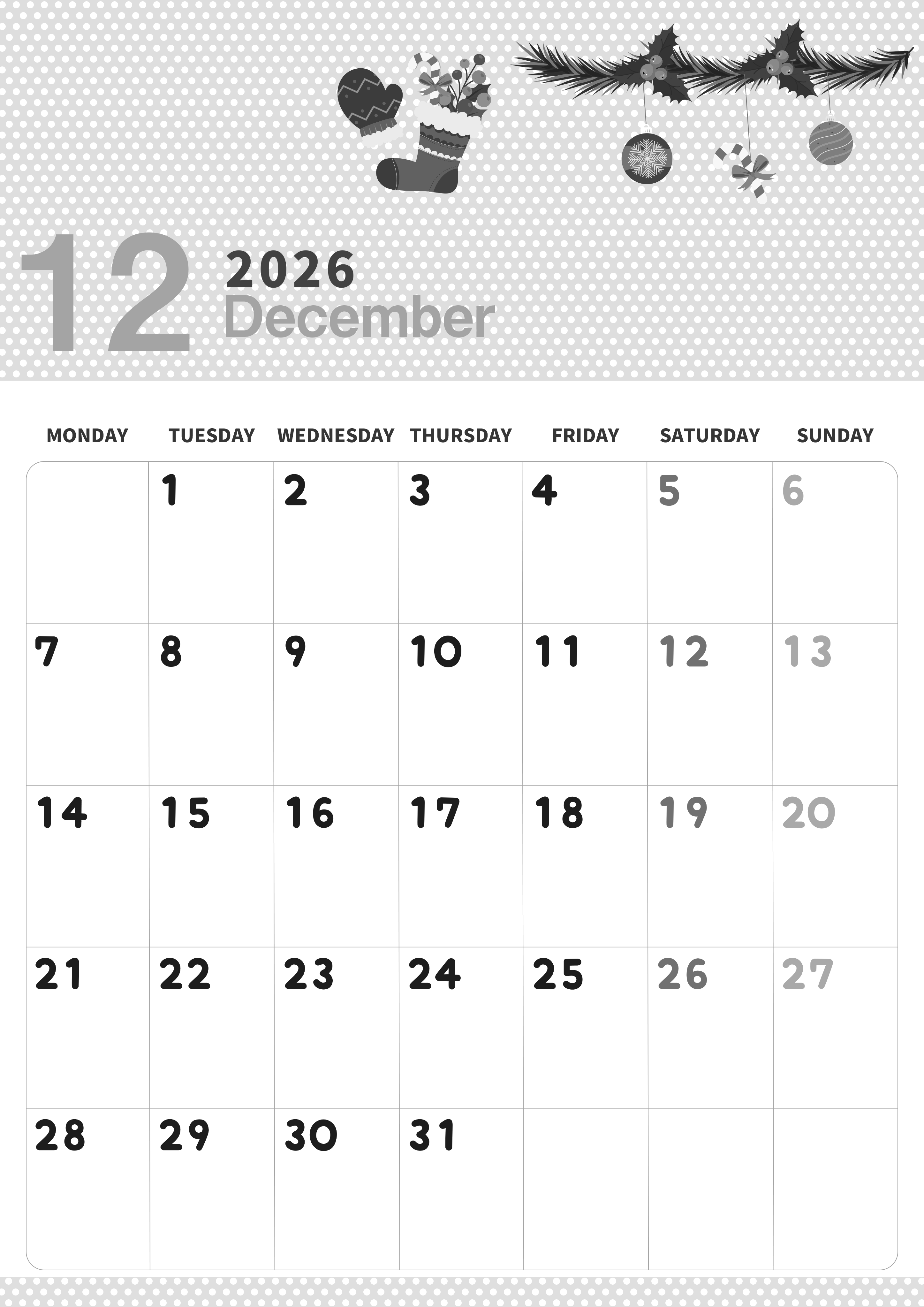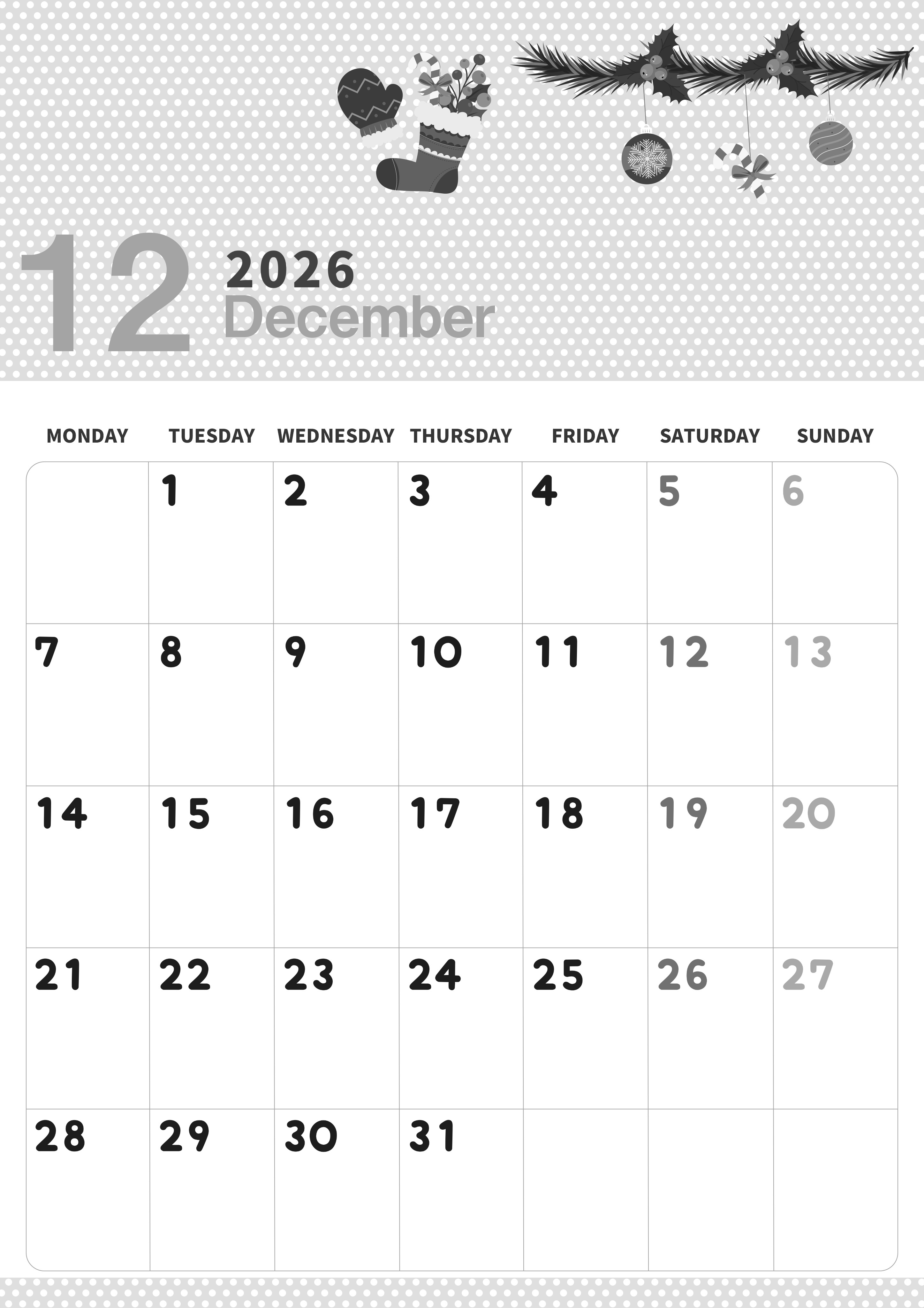 2026年12月縦型モノクロの月曜始まりの無料テンプレート白黒カレンダーです。ドットの背景にクリスマスのイラストを描く事でかわいいとおしゃれの共存を果たしている使いたくなるフリー素材に仕上げました。(2026-00321211)
