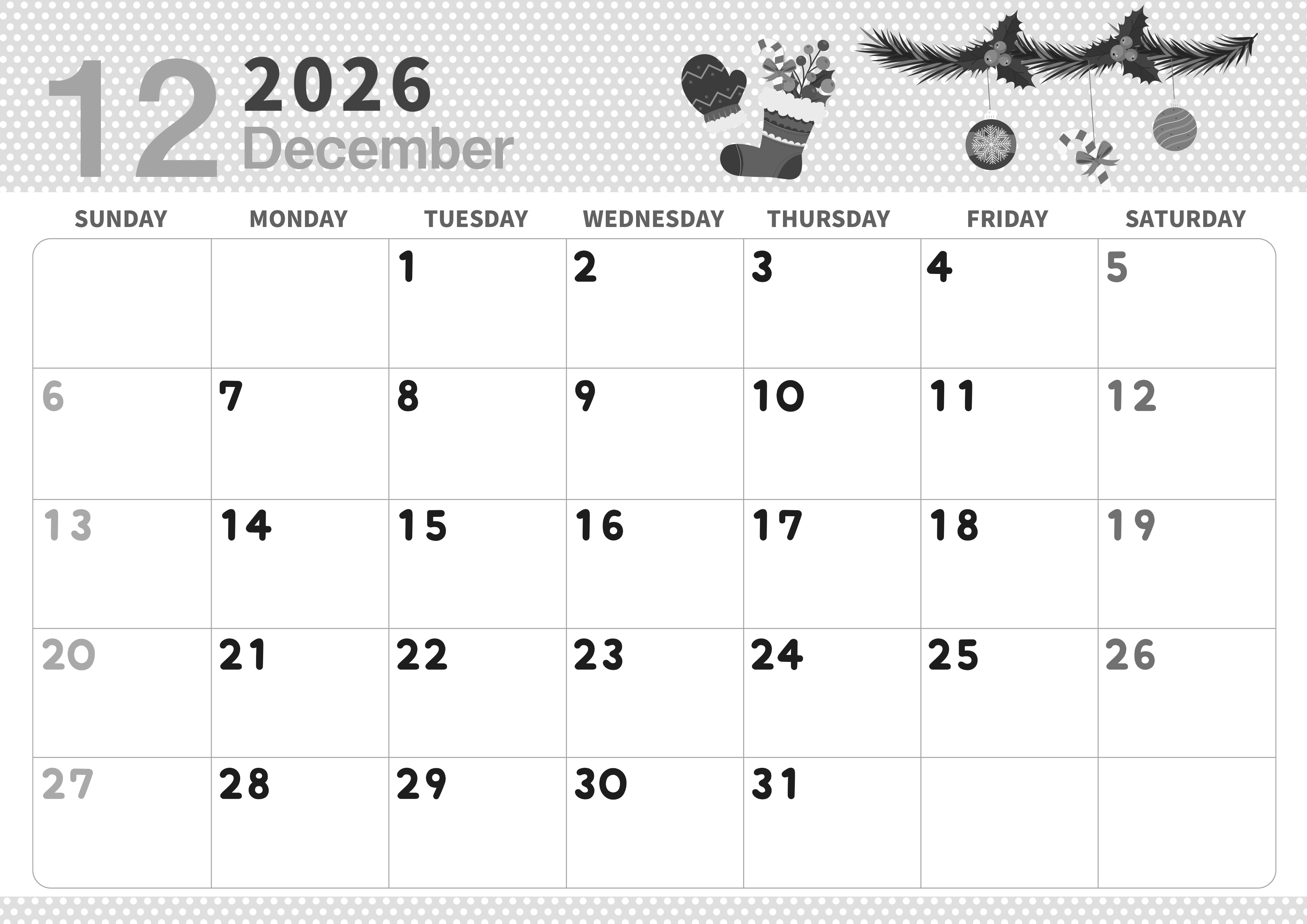 2026年12月横型モノクロの日曜始まり クリスマスイラストのおしゃれA4無料白黒カレンダー(2026-00321200)