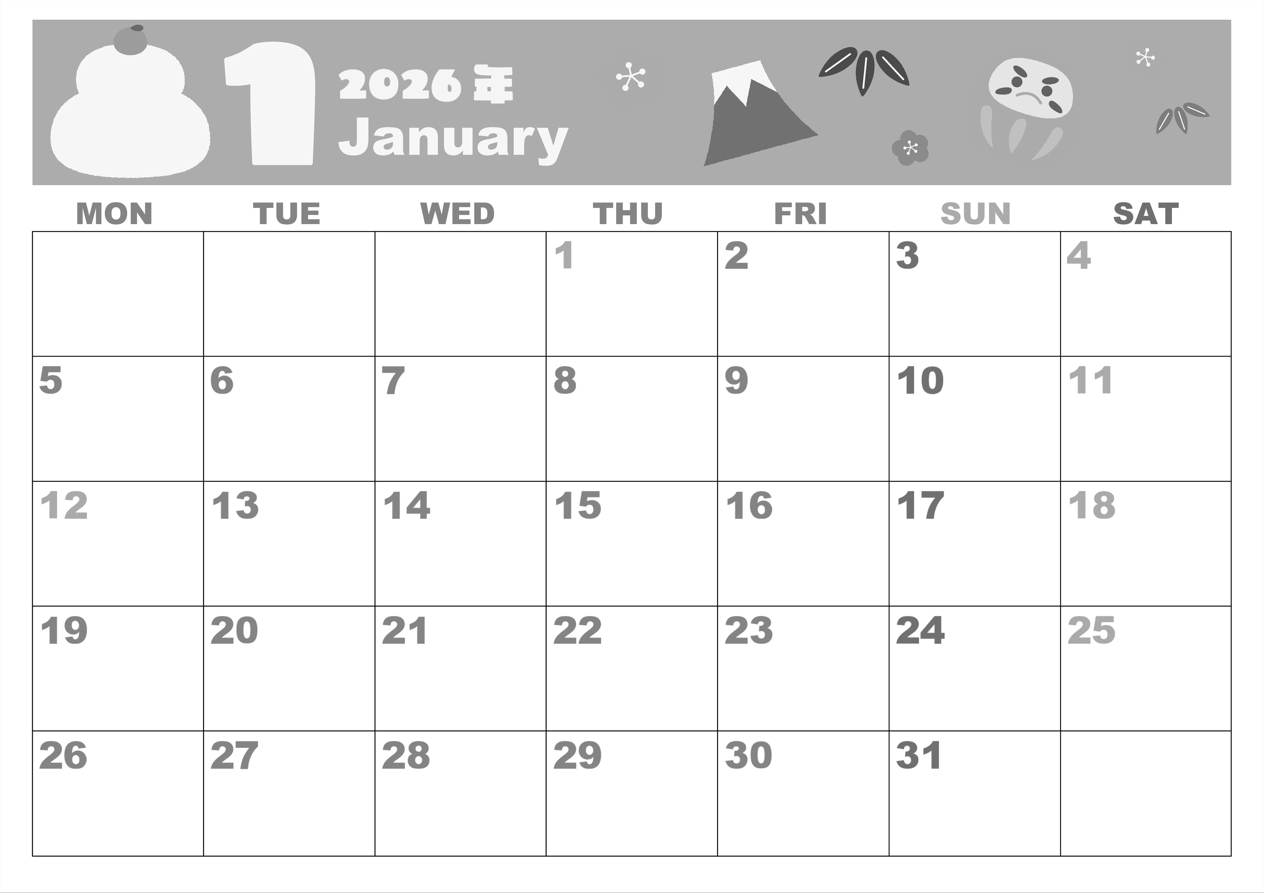 2026年1月横型モノクロの月曜始まりです。イラストはレトロでかわいいテイストだけでなくどこか懐かしさも醸し出されているような画像です。かがみもちとだるまと富士山と梅と竹といずれも元旦を連想させるようなモチーフを丸っこい筆走りで描いたポップな無料の白黒カレンダーです。(2026-00330101)