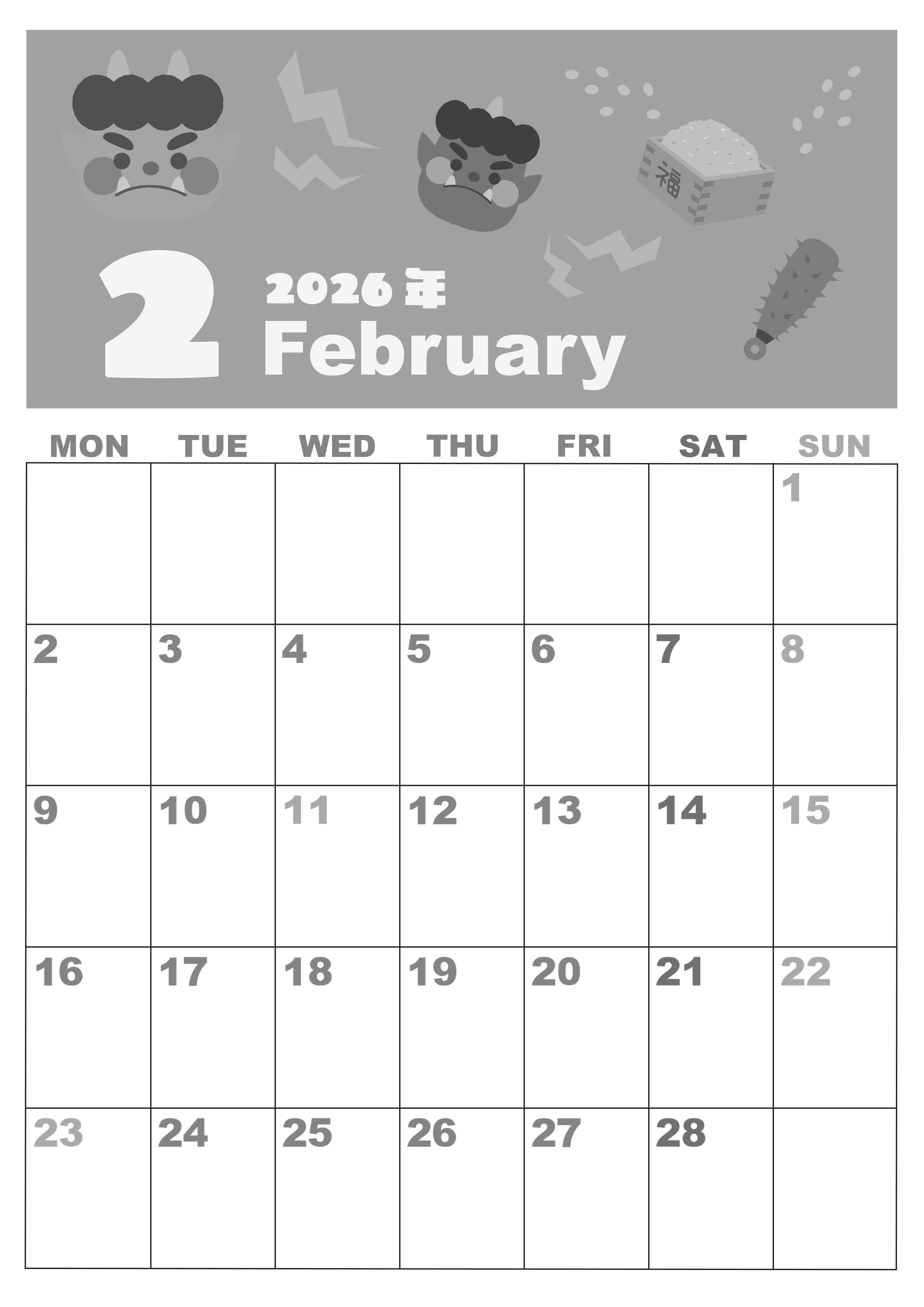 2026年2月縦型モノクロの月曜始まりの無料テンプレート白黒カレンダーです。月曜始まりの白黒カレンダーが使いやすいという人にとって最適な素材なのでダウンロードをおすすめします。イラストは赤鬼と青鬼と金棒でかわいいです。(2026-00330211)