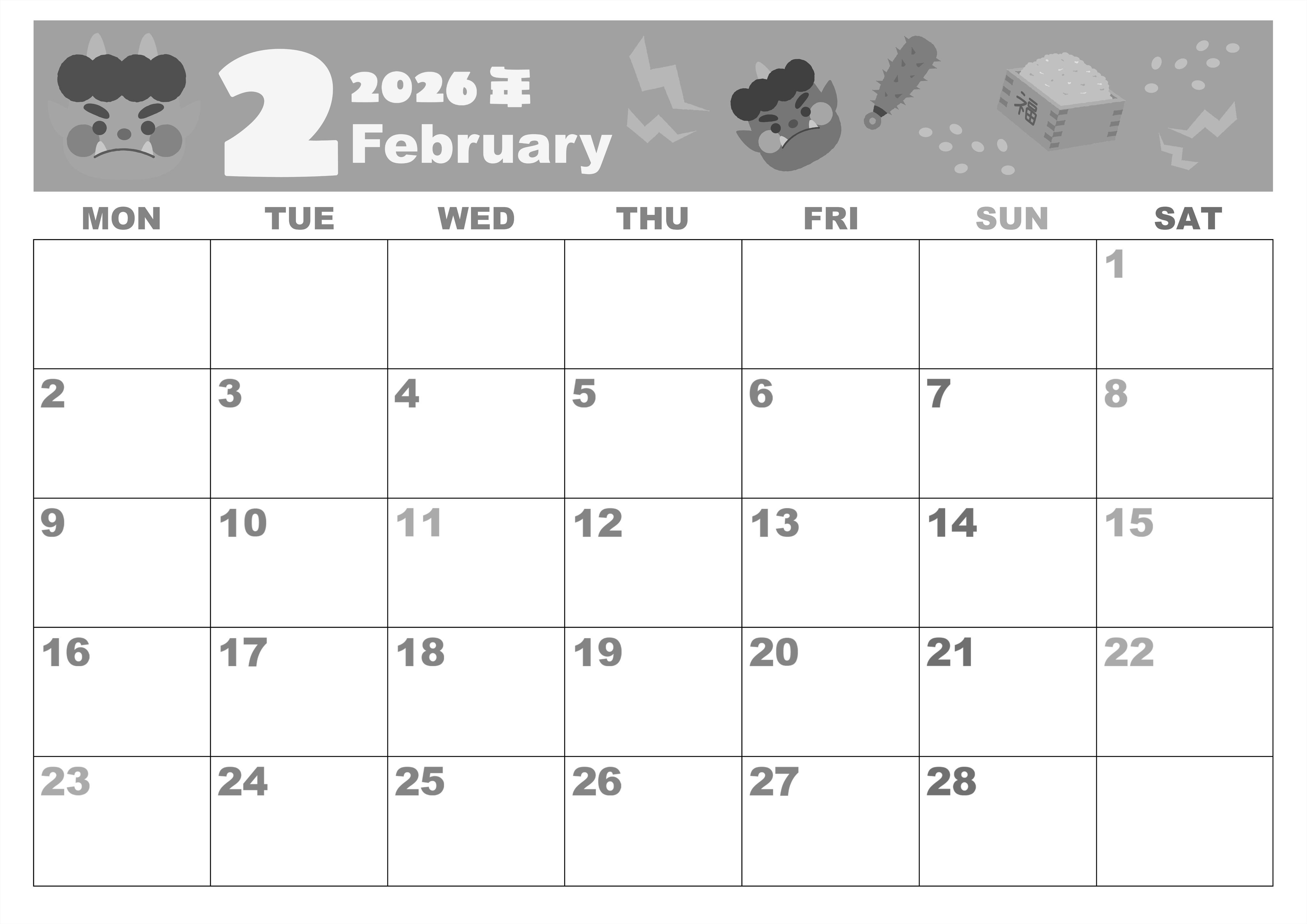 2026年2月横型モノクロの月曜始まりの無料テンプレート白黒カレンダーです。節分の豆まきをモチーフにしたポップでかわいいイラストの白黒カレンダーです。横型で月曜始まりなのでプランニングに適したフォーマットの無料素材です。(2026-00330201)