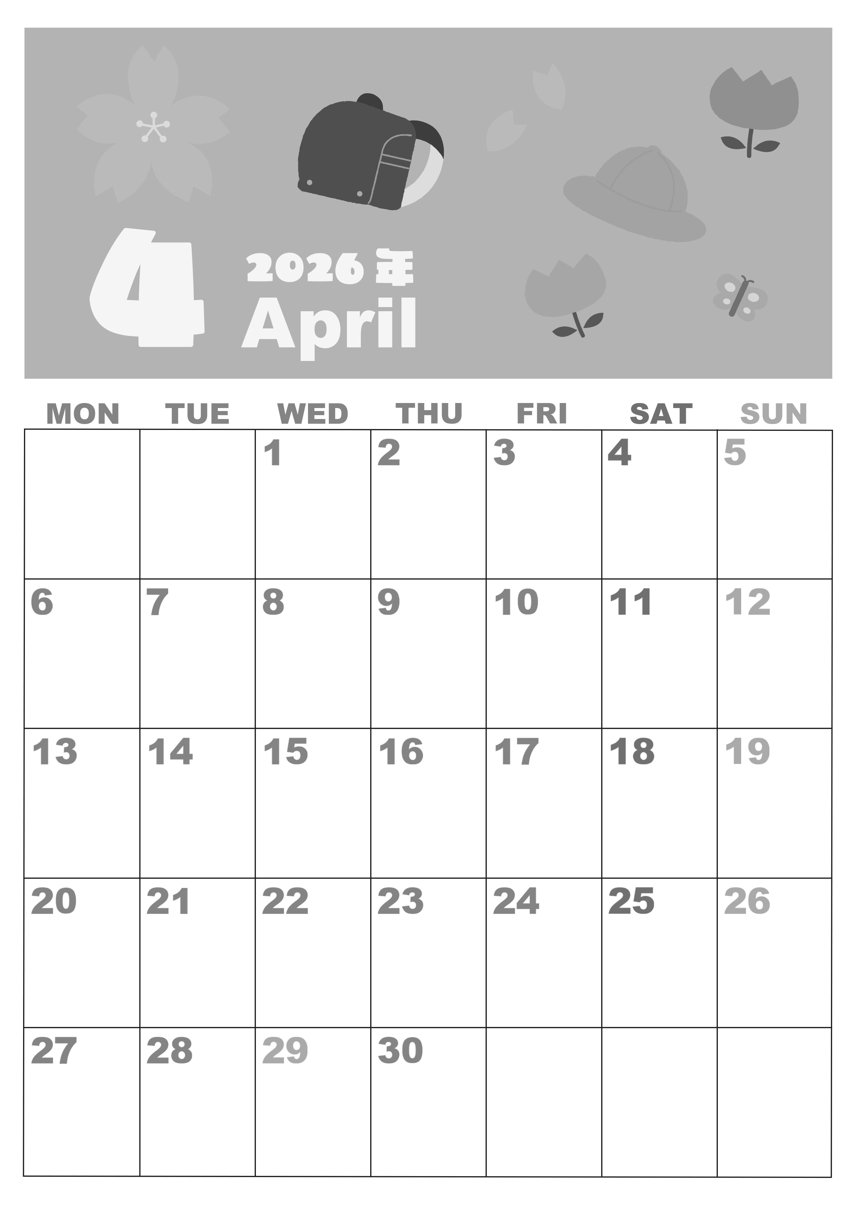 2026年4月縦型モノクロの月曜始まりの無料テンプレート白黒カレンダーです。月曜始まりで罫線もくっきりとしているのでタスク管理がとてもやりやすい白黒カレンダーです。イラストのランドセルやチューリップや帽子もかわいいです。(2026-00330411)