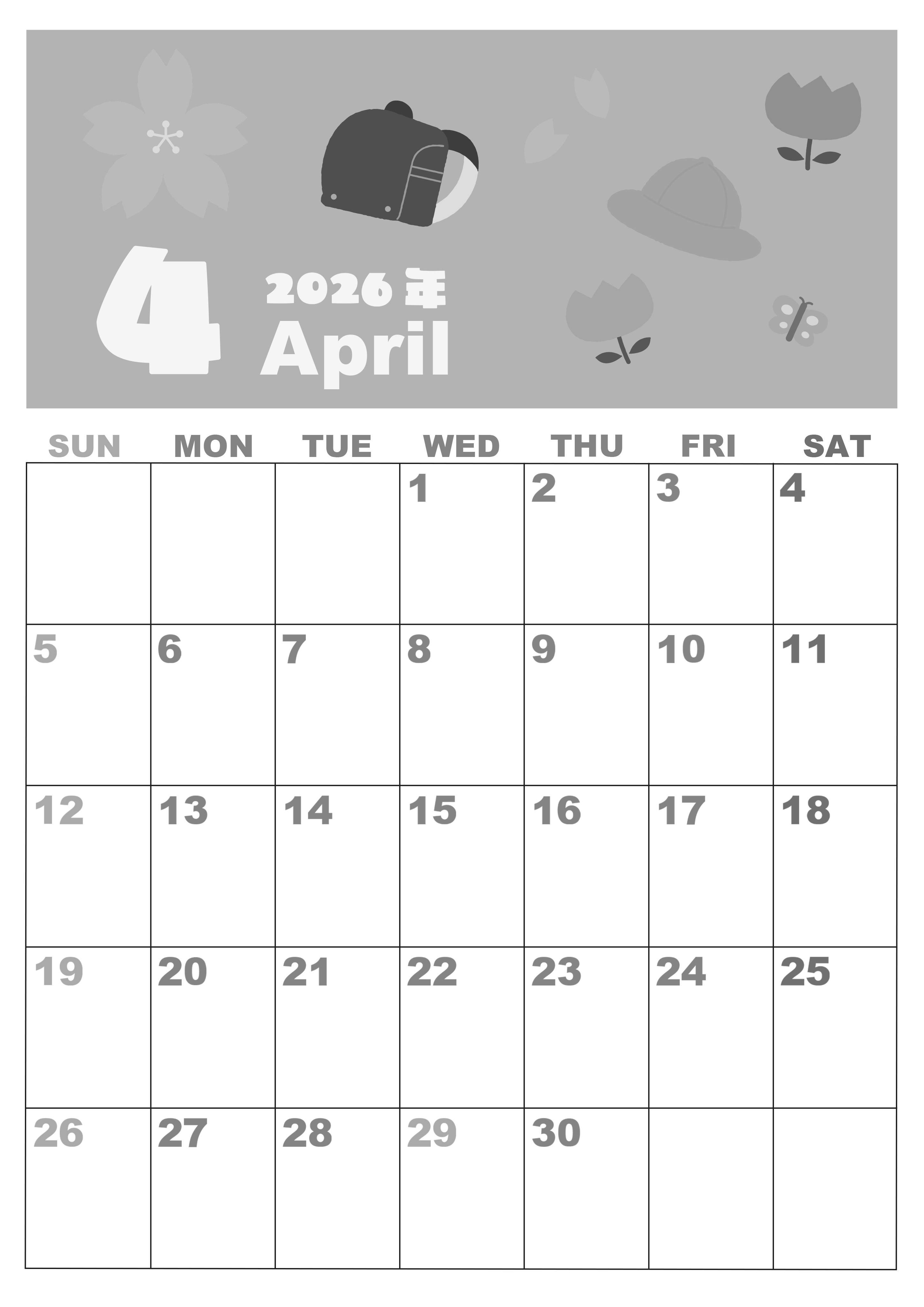 2026年4月縦型モノクロの日曜始まりの無料テンプレート白黒カレンダーです。元気な子供たちを連想させるようなかわいいランドセルのイラストが付いた白黒カレンダーです。家族でのスケジュール把握に適しているフリー素材です。(2026-00330410)