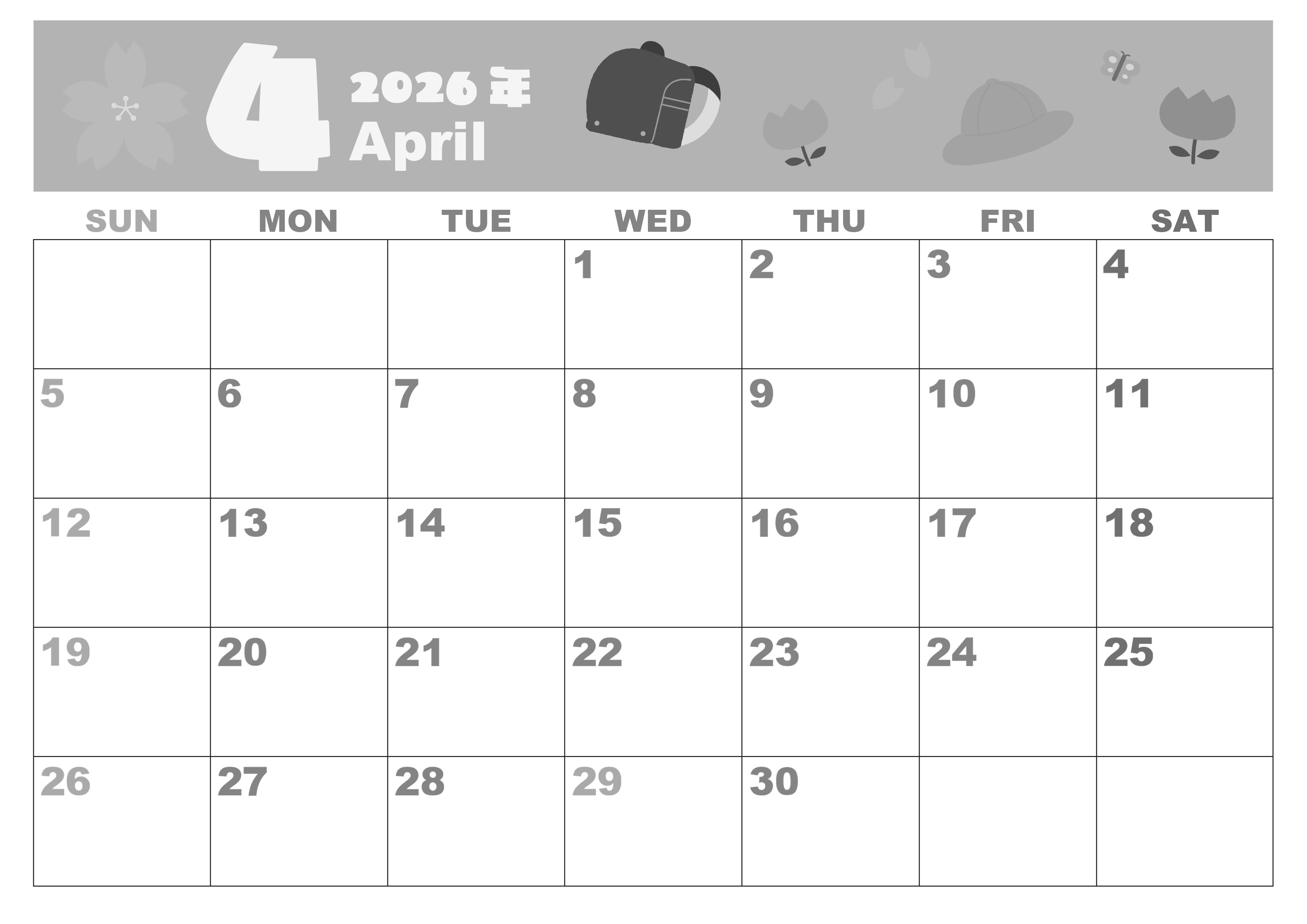 2026年4月横型モノクロの日曜始まりの無料テンプレート白黒カレンダーです。太めのまるっこい文字がとてもかわいいランドセルのイラスト付きの白黒カレンダーです。罫線も見やすく直線なので予定を書き込みやすいレイアウトとなっています。(2026-00330400)
