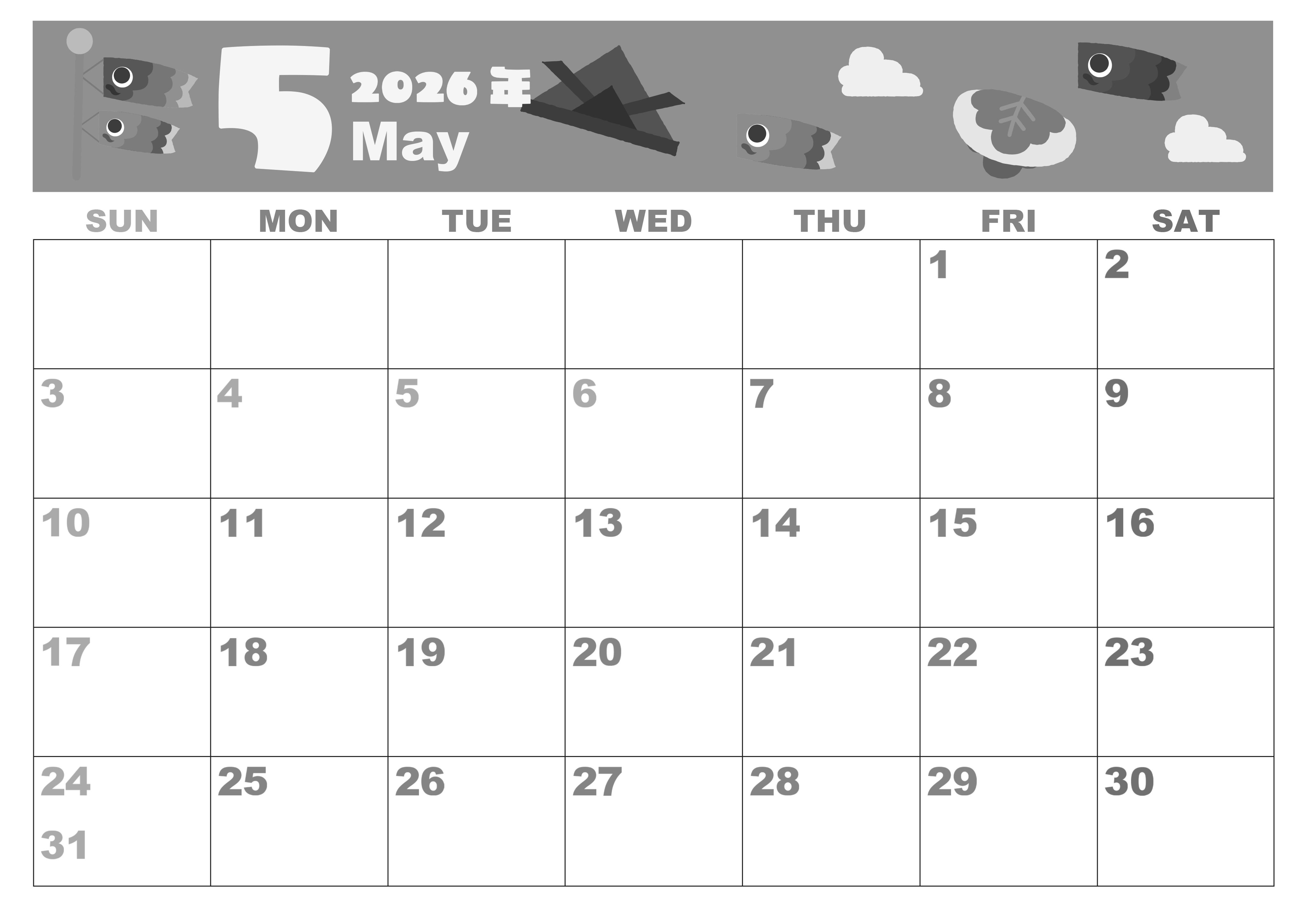 2026年5月横型モノクロの日曜始まりの無料テンプレート白黒カレンダーです。躍動感のある鯉のぼりや柏餅や兜といった5月の行事にちなんだコンテンツのイラストが盛り込まれたかわいいイラスト白黒カレンダーです。(2026-00330500)