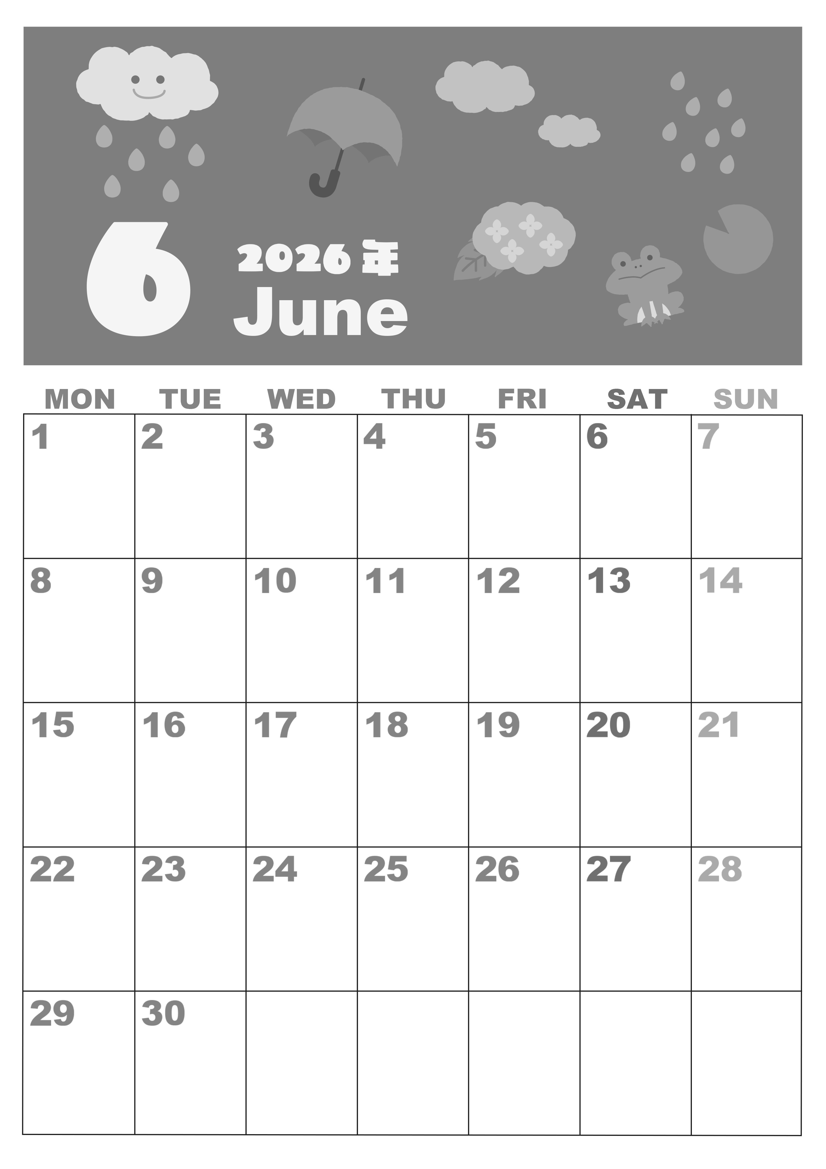2026年・無料のカレンダーテンプレート 2026年6月縦型モノクロの月曜始まり 雨イラストのかわいいA4無料白黒カレンダー(2026-00330611) 素材状デザイン王 2025年4月1日 2026年6月縦型モノクロの月曜始まりの無料テンプレート白黒カレンダーです。月曜始まりで見やすい白黒カレンダーです。雨雲がもくもくとしてかわいいイラストも魅力的です。オリジナル素材で個性的です。(2026-00330611) 6月 縦型のカレンダー 月曜始まり 白黒 カレンダーデザイン-0033