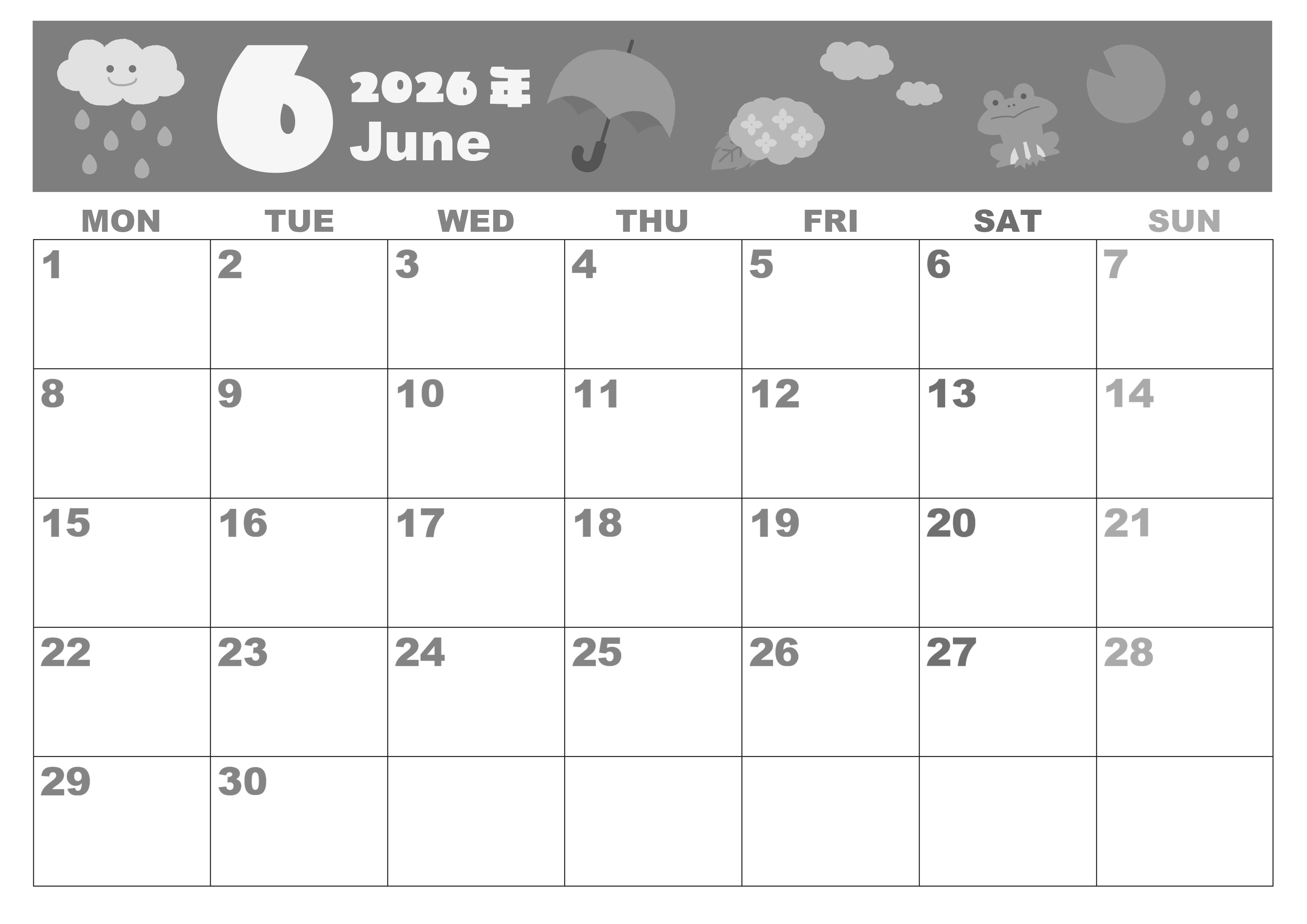 2026年6月横型モノクロの月曜始まりの無料テンプレート白黒カレンダーです。太文字の6月が白抜きされていて周りのイラストも梅雨を思わせるかわいいイラストです。月曜始まりタイプの白黒カレンダーに慣れ親しんでいる人にダウンロードをおすすめします。(2026-00330601)