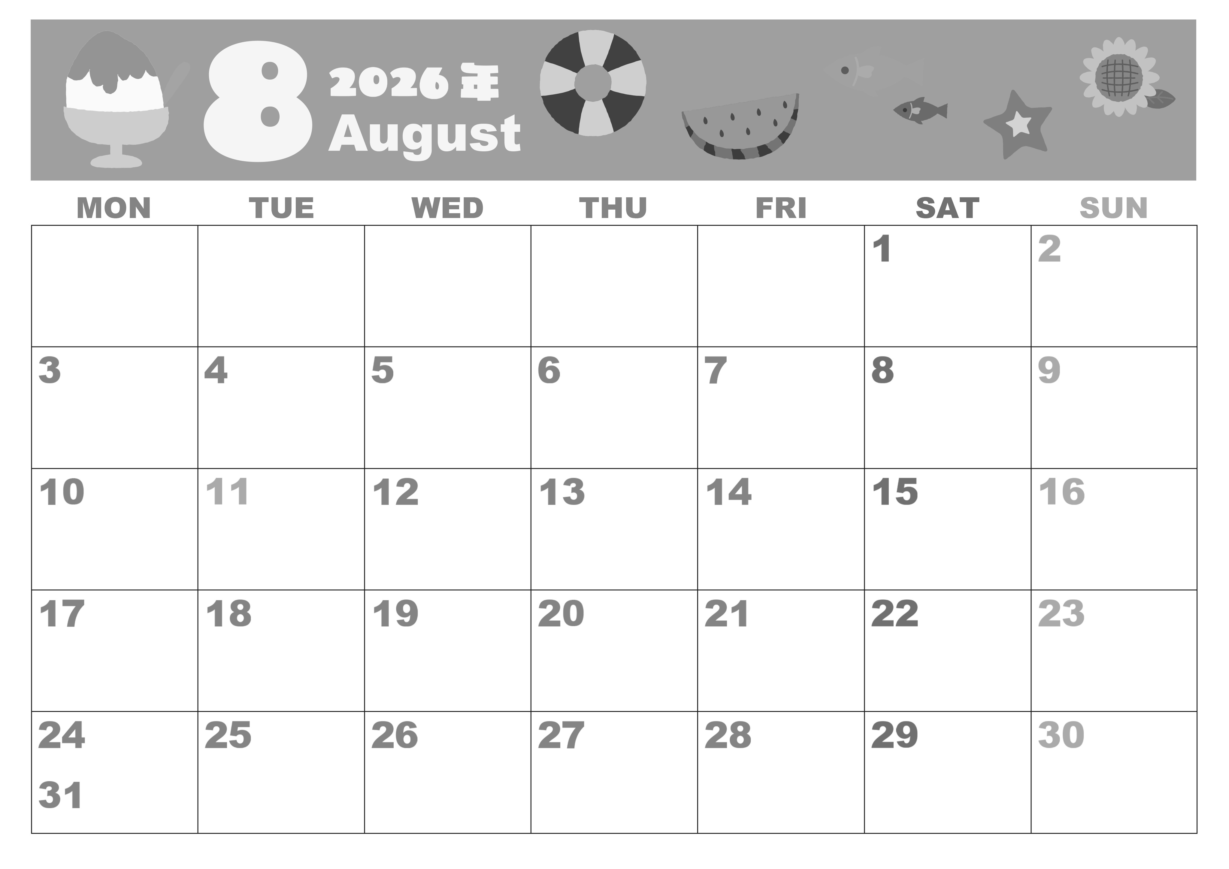 2026年8月横型モノクロの月曜始まりの無料テンプレート白黒カレンダーです。月曜始まりで利便性の高い白黒カレンダー素材は無料で使えます。白く大きな数字の文字がまるっこくてかわいいです。イラストは夏休みがテーマです。(2026-00330801)