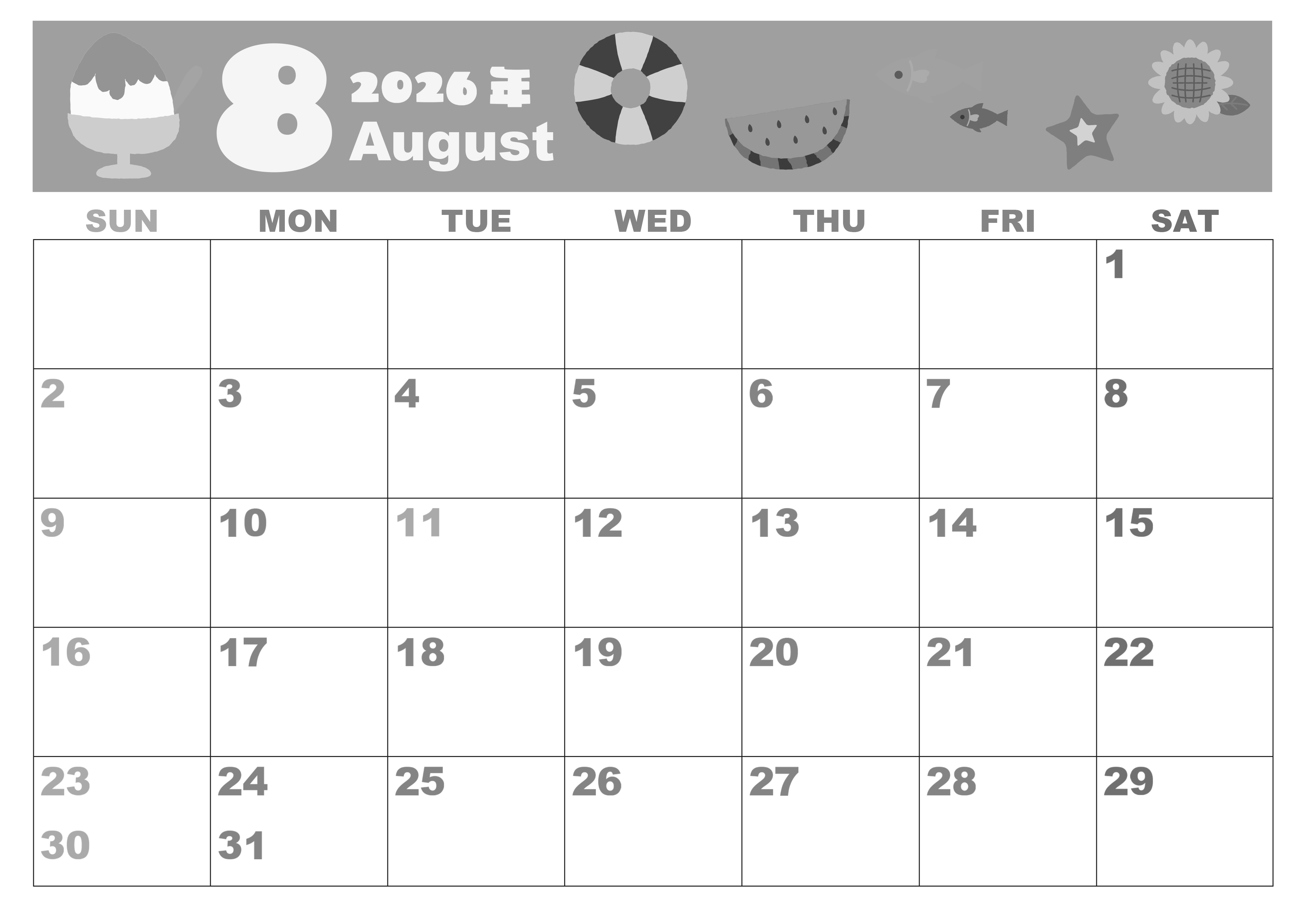 2026年8月横型モノクロの日曜始まりの無料テンプレート白黒カレンダーです。ぽってりとした8月の文字が存在感があってかわいい夏休みをテーマにしたポップレトロなイラスト白黒カレンダーです。A4サイズで無料にてお使い頂けます。(2026-00330800)