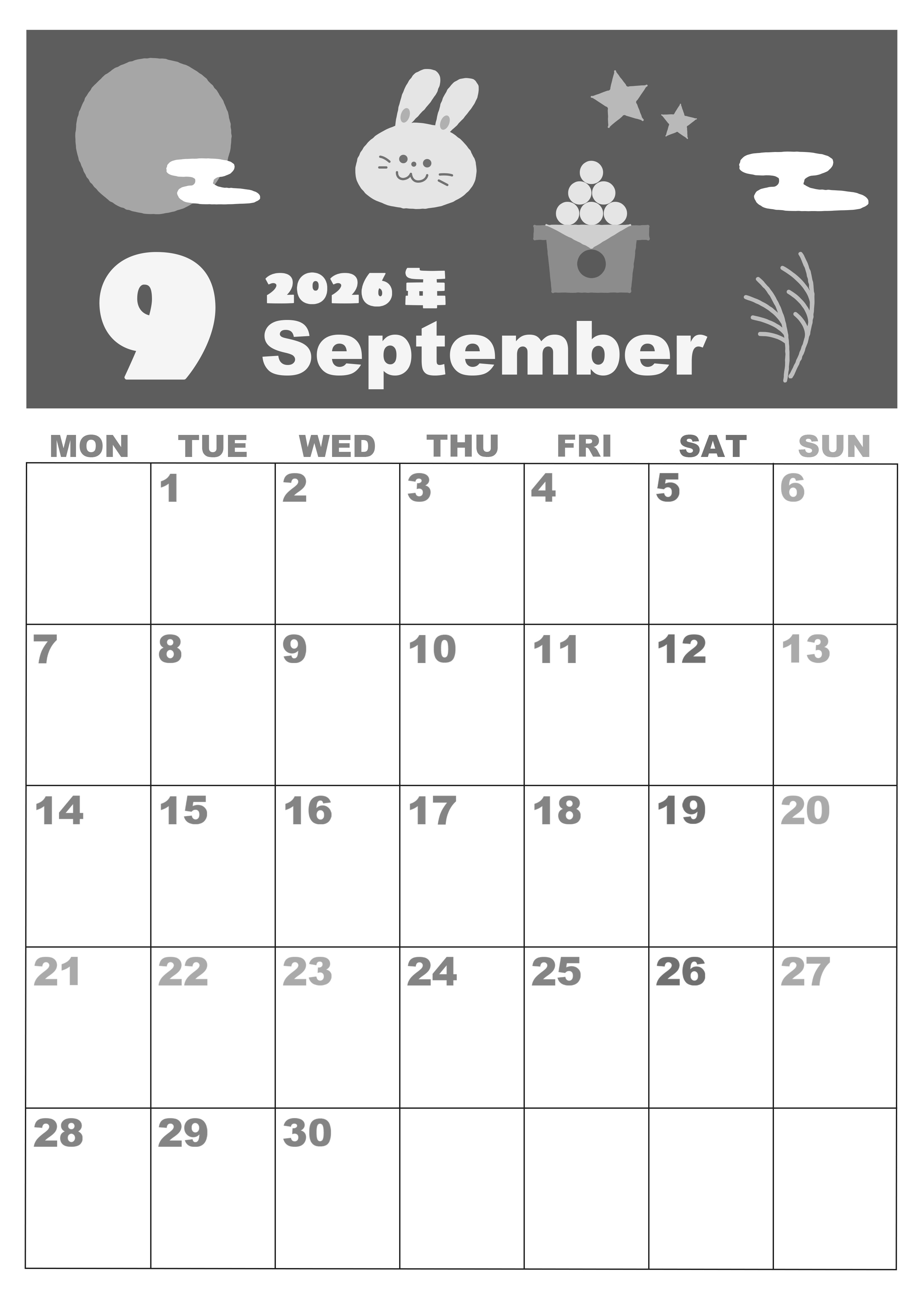 2026年9月縦型モノクロの月曜始まりの無料テンプレート白黒カレンダーです。文字の色分けがされているので予定管理にとても向いています。お月見をテーマに取り上げたイラストもかわいいので使うモチベーションが上がります。(2026-00330911)