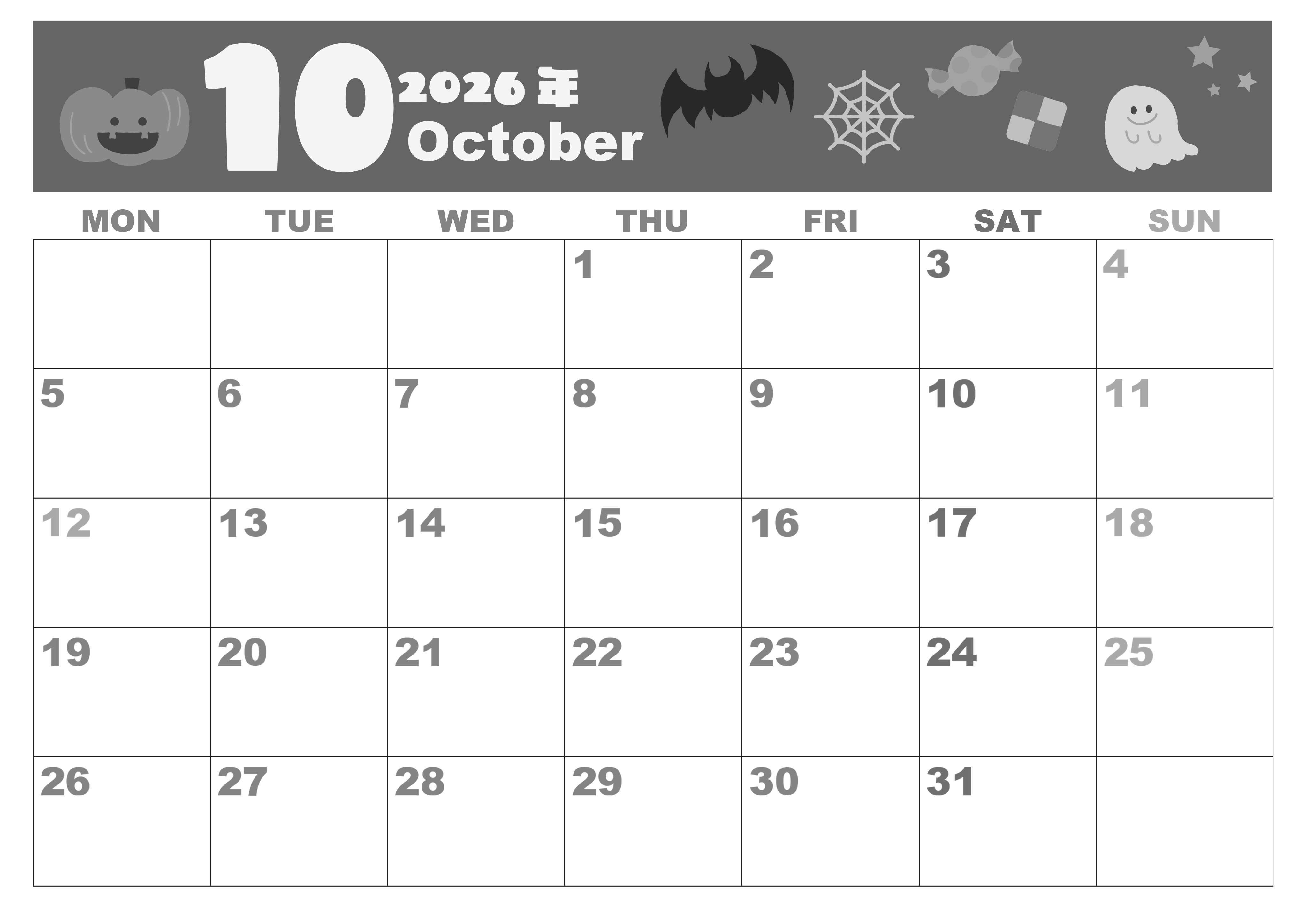 2026年・無料のカレンダーテンプレート 2026年10月横型モノクロの月曜始まり お菓子イラストのかわいいA4無料白黒カレンダー(2026-00331001) 素材状デザイン王 2025年4月1日 2026年10月横型モノクロの月曜始まりの無料テンプレート白黒カレンダーです。クッキーやキャンディーといったお菓子だけでなくお化けやカボチャのイラストもとてもかわいい月曜始まり白黒カレンダーです。(2026-00331001) 10月 横型のカレンダー 月曜始まり 白黒 カレンダーデザイン-0033