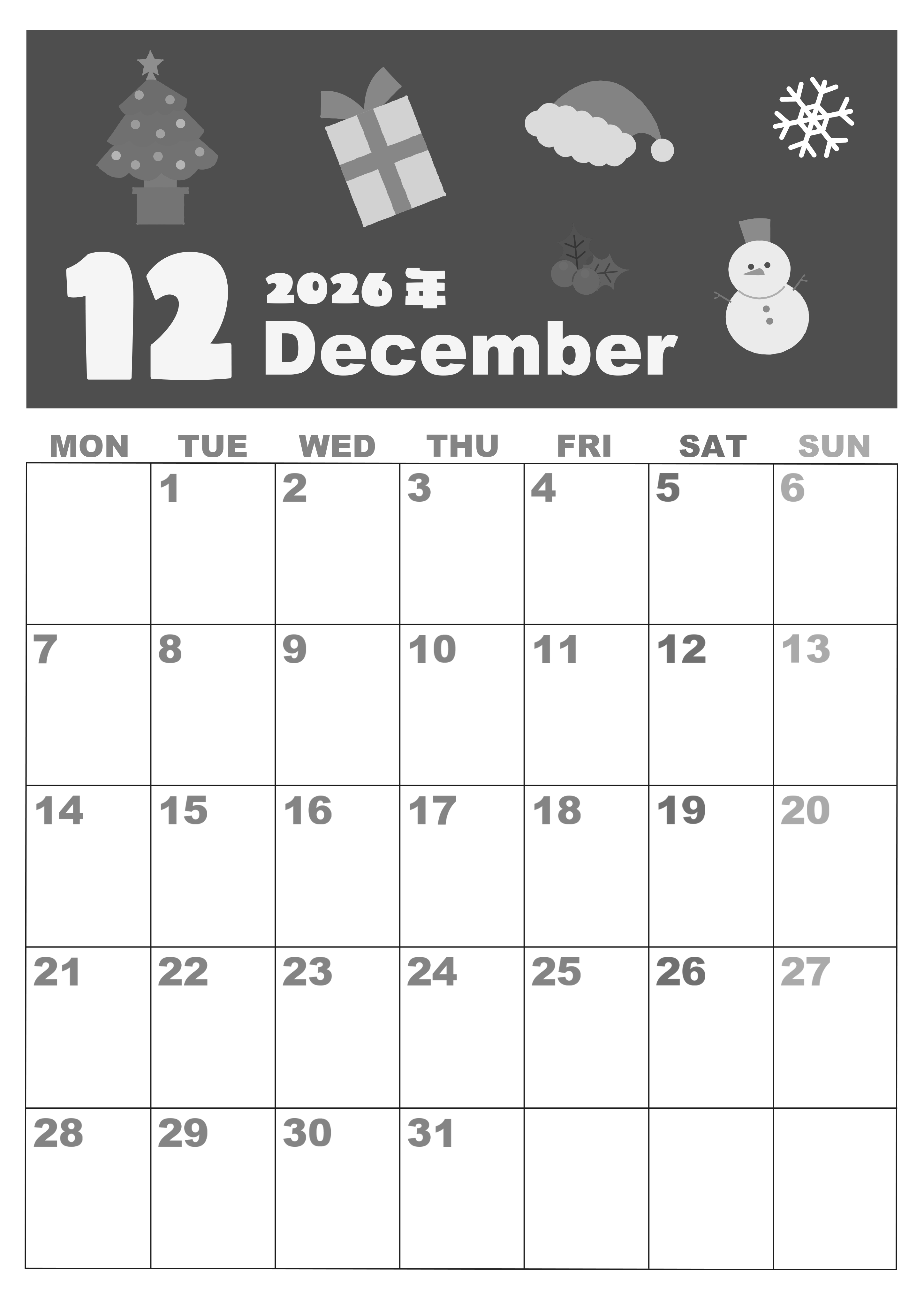 2026年12月縦型モノクロの月曜始まりの無料テンプレート白黒カレンダーです。年末のお仕事や家族の行事はバタバタしていますがクリスマスは楽しみが詰まっています。そんな楽しみを伝えてくれるようなかわいいイラストです。(2026-00331211)