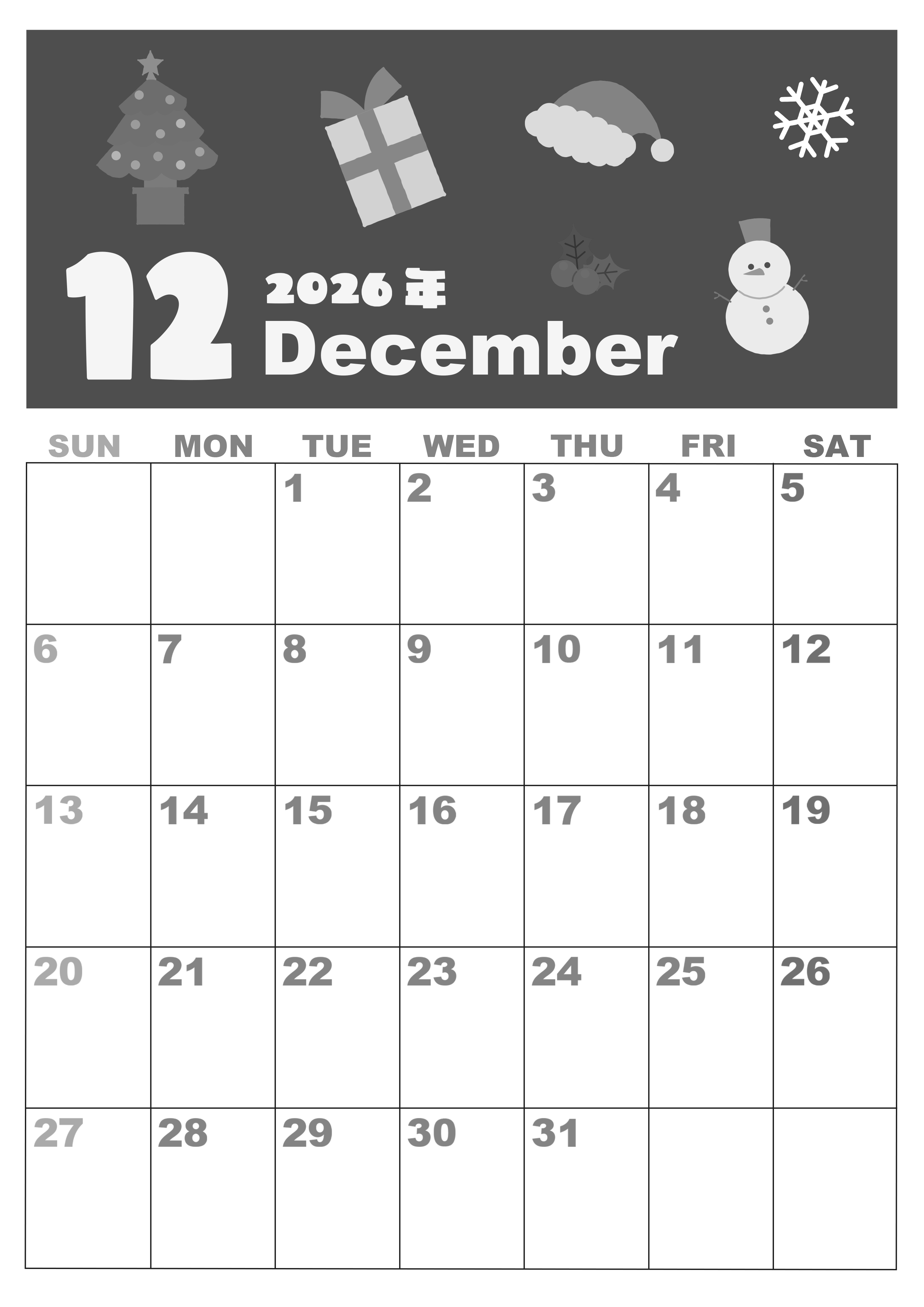 2026年12月縦型モノクロの日曜始まりの無料テンプレート白黒カレンダーです。行事のワクワクに拍車をかけてくれるようなかわいいイラストがとても特徴的なレイアウトとなっています。予定の把握にもおすすめです。(2026-00331210)