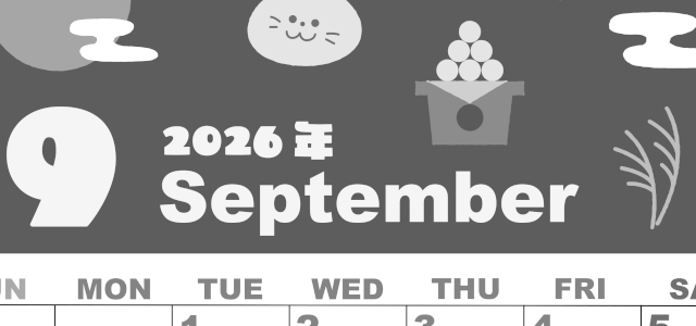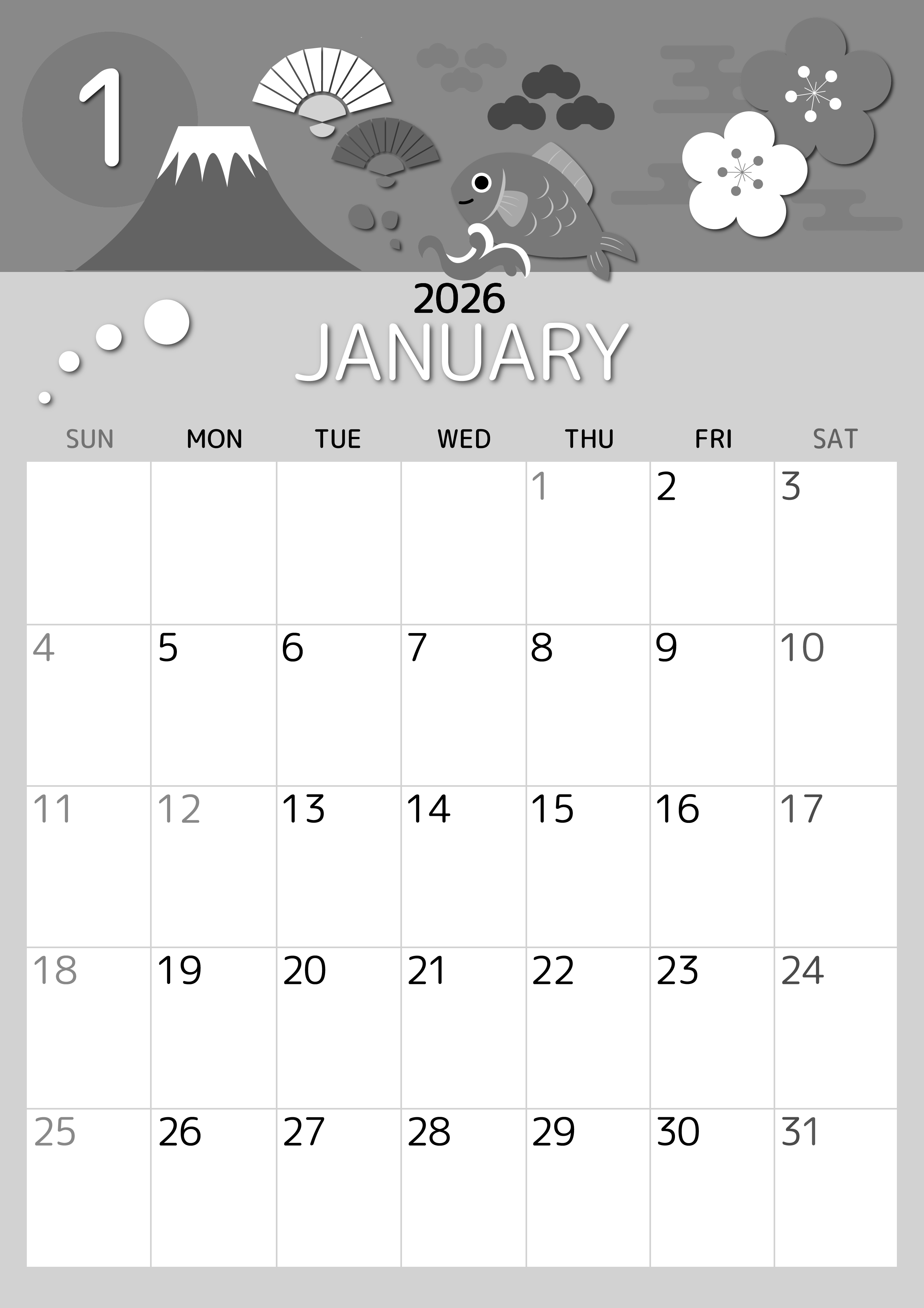 2026年1月縦型モノクロの日曜始まり白黒カレンダーです。和風でデザインがはっきりしているので印刷用にぴったりな白黒カレンダーです。イラストもそれぞれのポイントがかわいいので使っていてウキウキするようなフリー素材です。(2026-00340110)