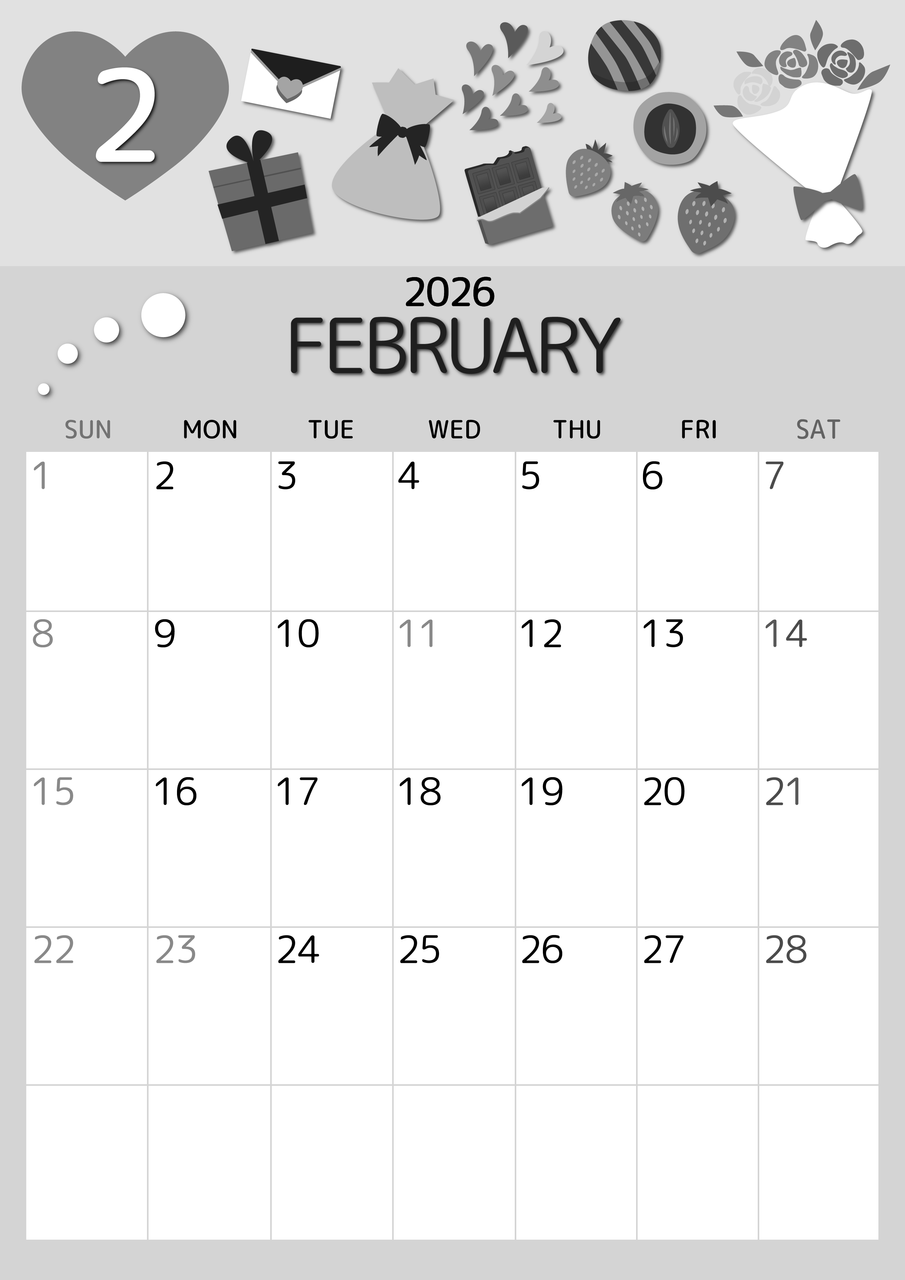 2026年・無料のカレンダーテンプレート 2026年2月縦型モノクロの日曜始まり プレゼントがかわいいイラストA4無料白黒カレンダー(2026-00340210) 素材状デザイン王 2025年4月1日 2026年2月縦型モノクロの日曜始まりの無料テンプレート白黒カレンダーです。ハートの中に2月の文字があるかわいい遊び心たっぷりの白黒カレンダーです。縦型なので壁に貼って利用しやすいサイズ感です。(2026-00340210) 2月 縦型のカレンダー 日曜始まり 白黒 カレンダーデザイン-0034