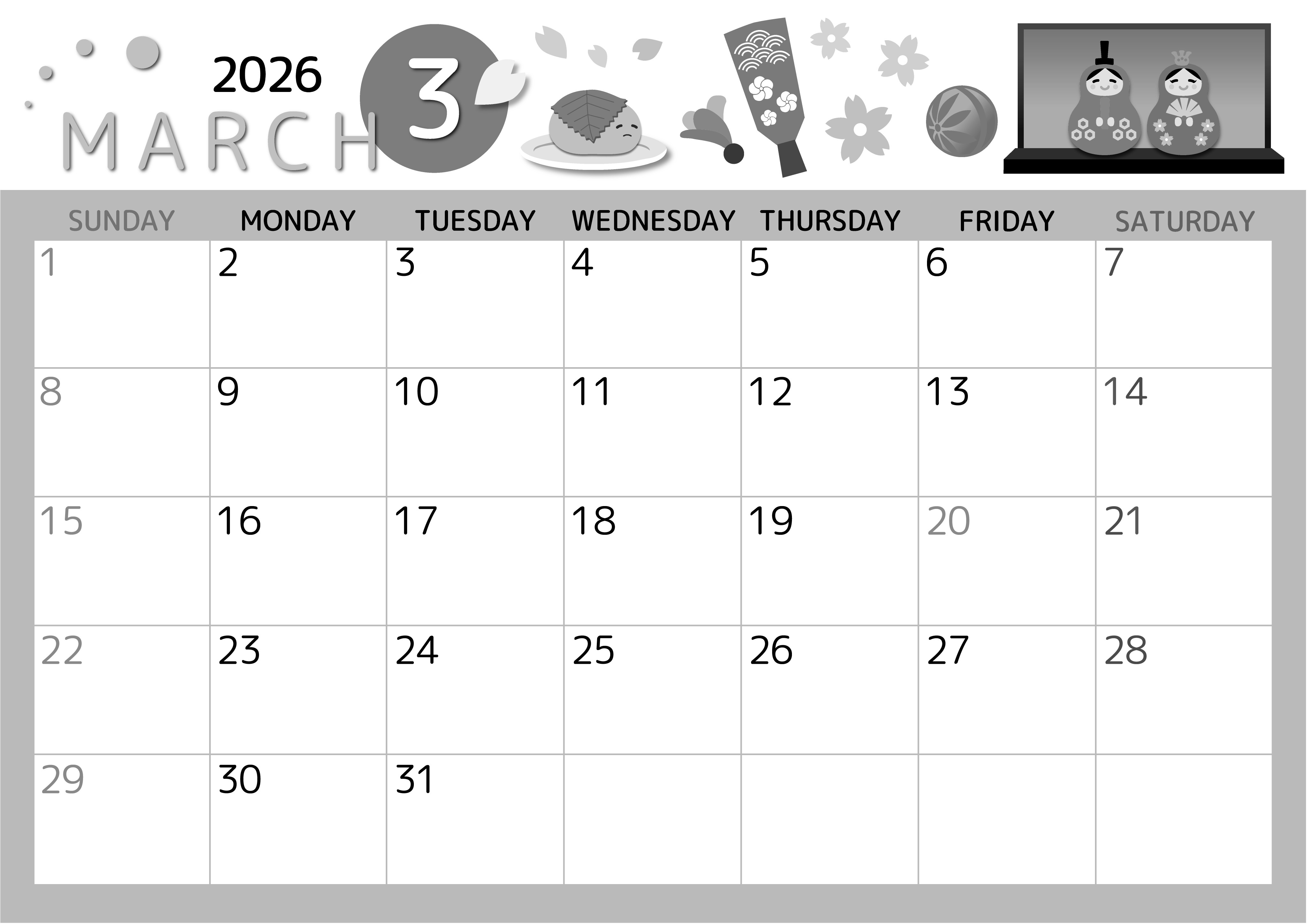 2026年3月横型モノクロの日曜始まりの無料テンプレート白黒カレンダーです。予定を書き込む箇所は落ち着いたグリーンのフレームで囲まれている実用的な白黒カレンダー素材です。シンプルかつかわいいイラスト付きでダウンロードは無料です。(2026-00340300)