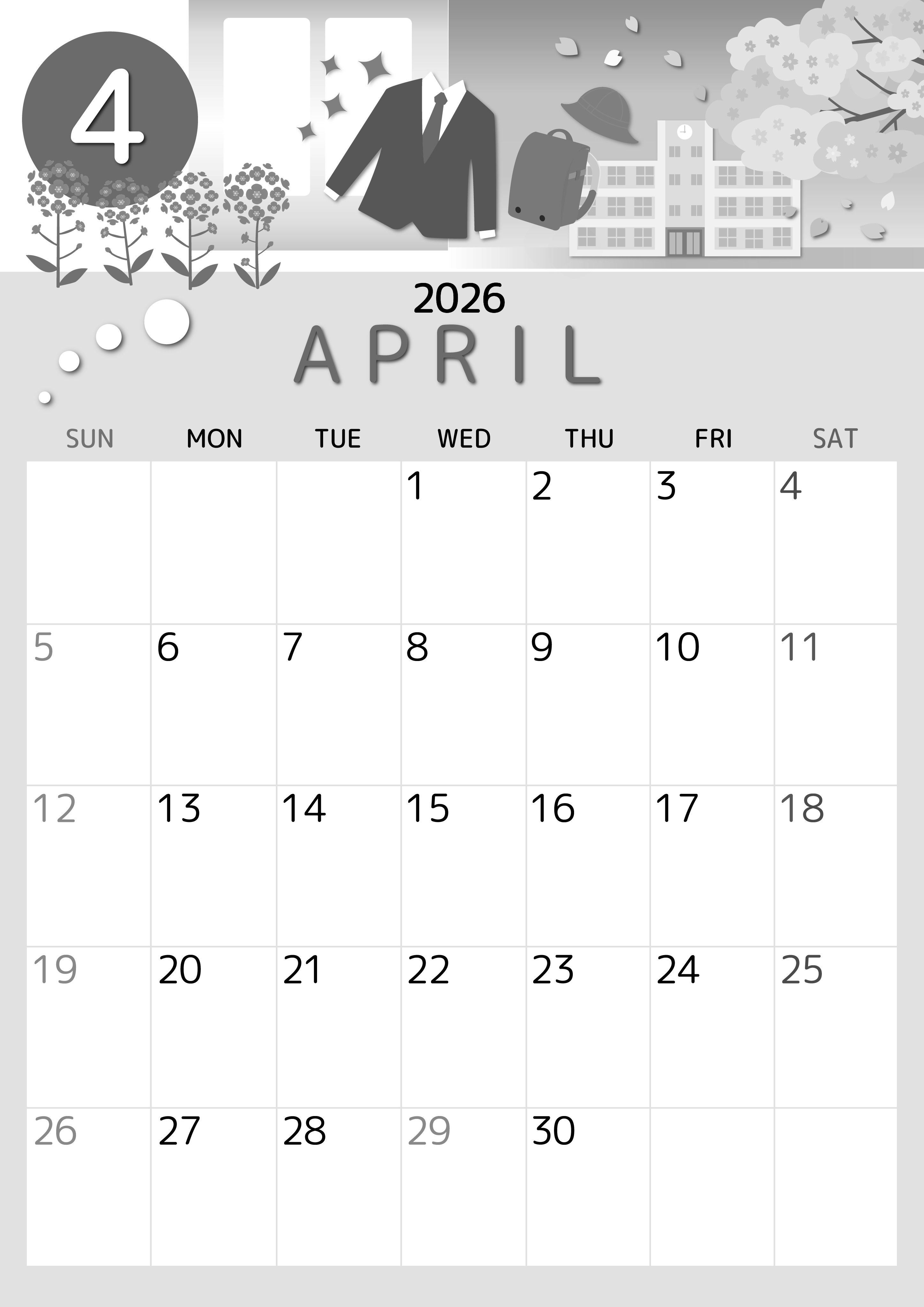 2026年4月縦型モノクロの日曜始まりの無料テンプレート白黒カレンダーです。入学式だとわかるような学校や桜の木がいっぱいのかわいいイラスト白黒カレンダーです。シンプルな罫線なのでスケジュール管理に向いています。(2026-00340410)