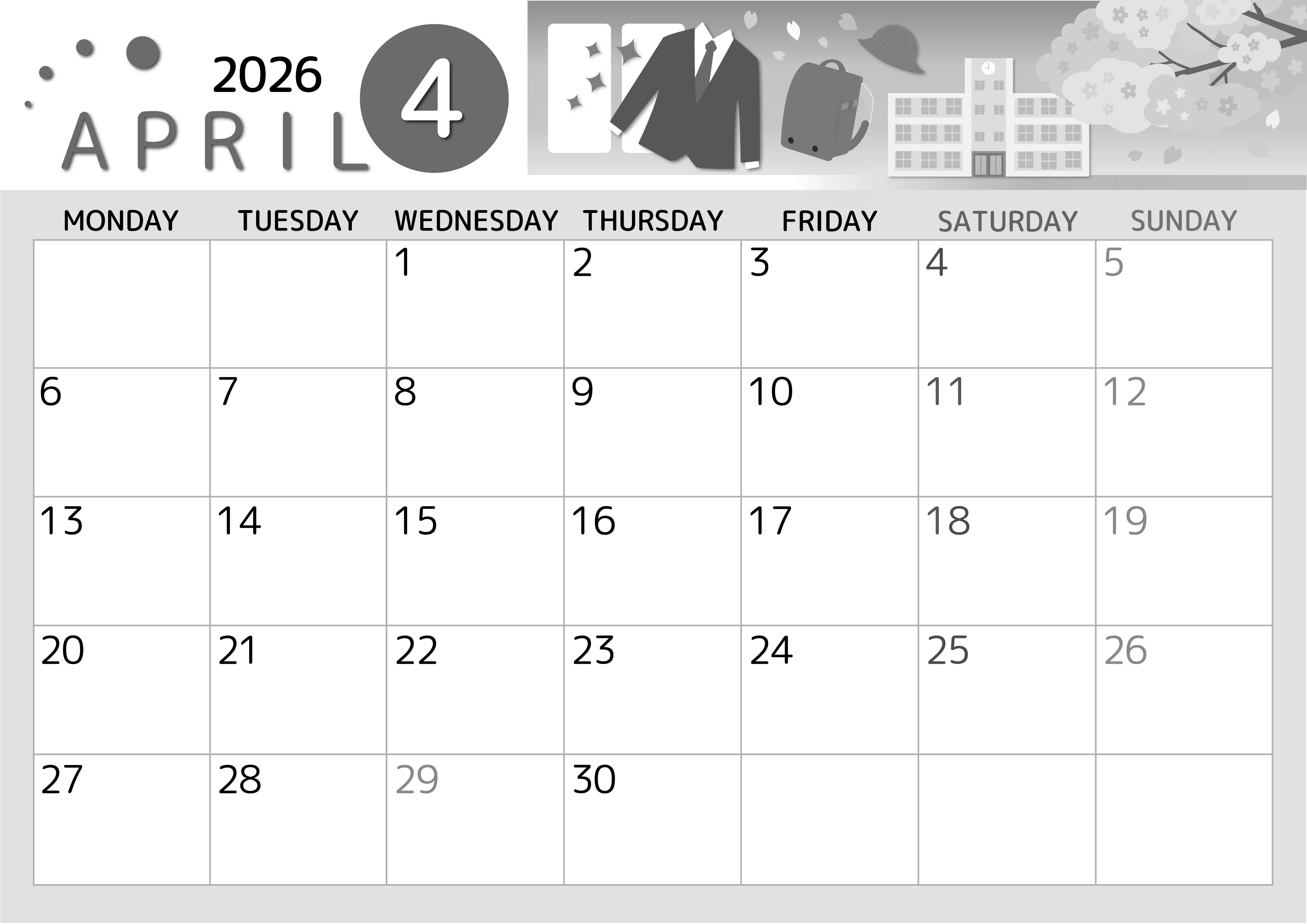 2026年4月横型モノクロの月曜始まりの無料テンプレート白黒カレンダーです。月曜始まりの白黒カレンダーなので子供の新学期の予定を把握するのにぴったりな無料テンプレートです。入学式のイラストもかわいいです。(2026-00340401)