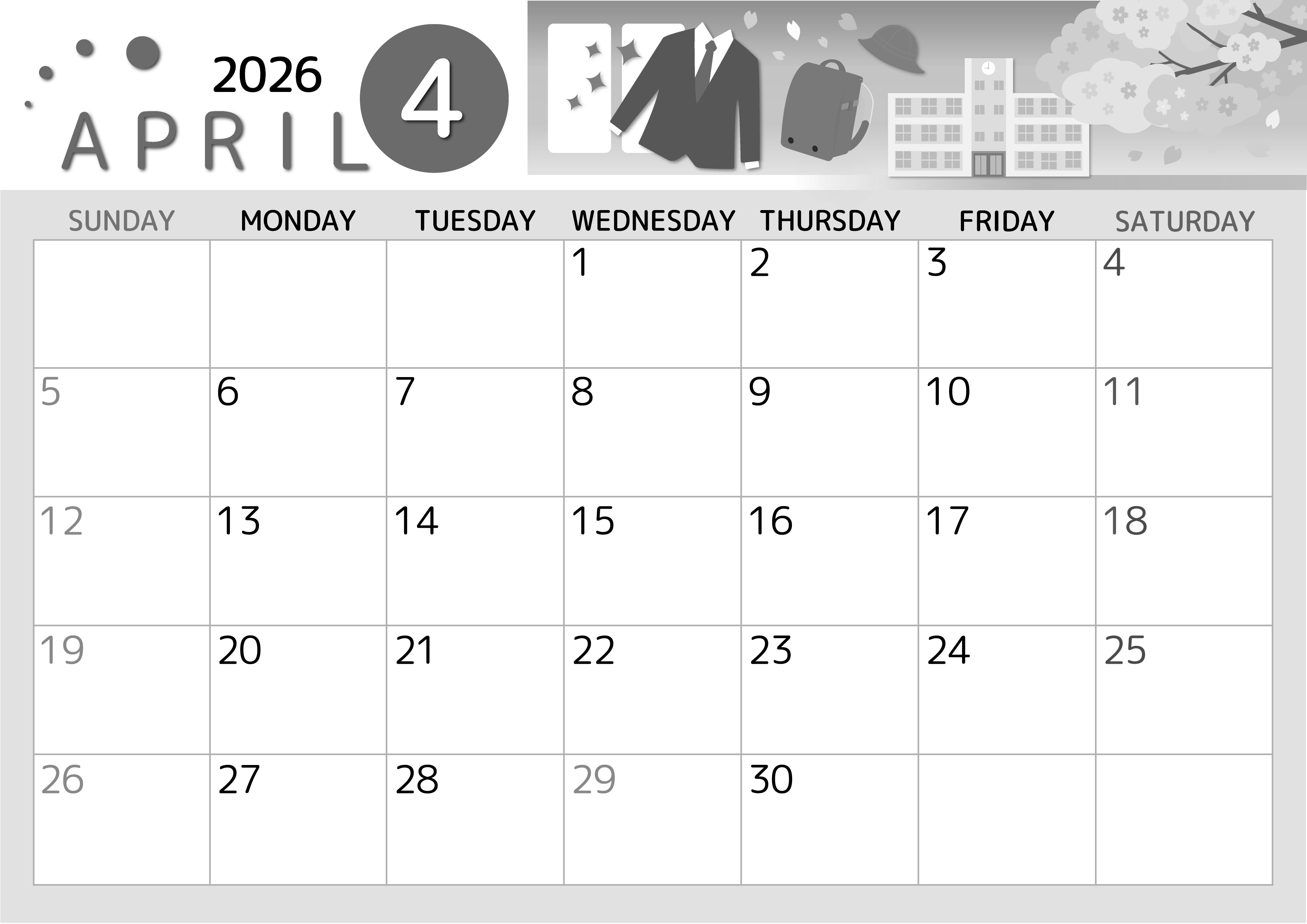 2026年4月横型モノクロの日曜始まりの無料テンプレート白黒カレンダーです。入学式に不可欠な制服やランドセルといったイラストがもりだくさんのかわいい白黒カレンダーです。子供たちの勉強の予定を立てるのにもおすすめします。(2026-00340400)