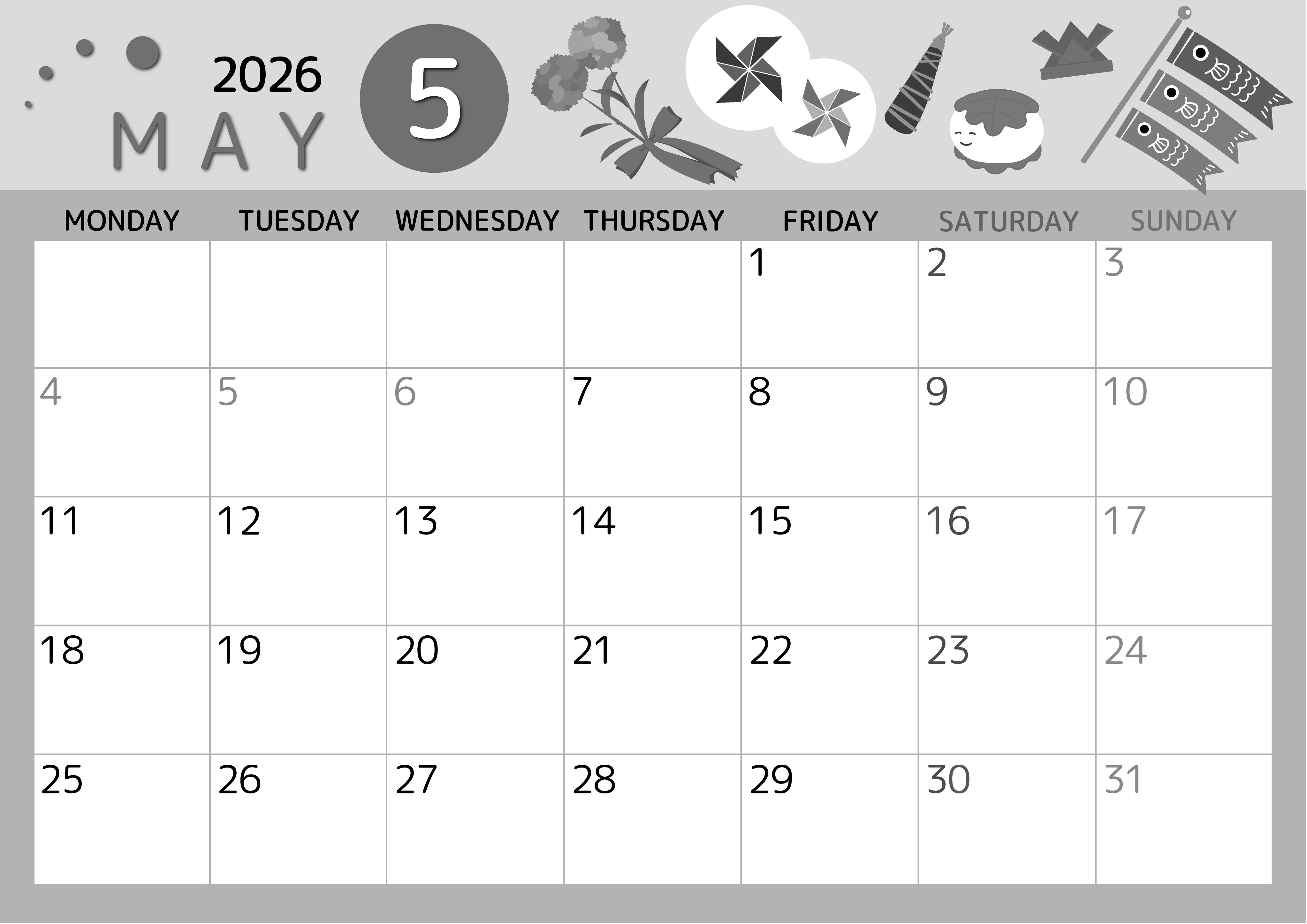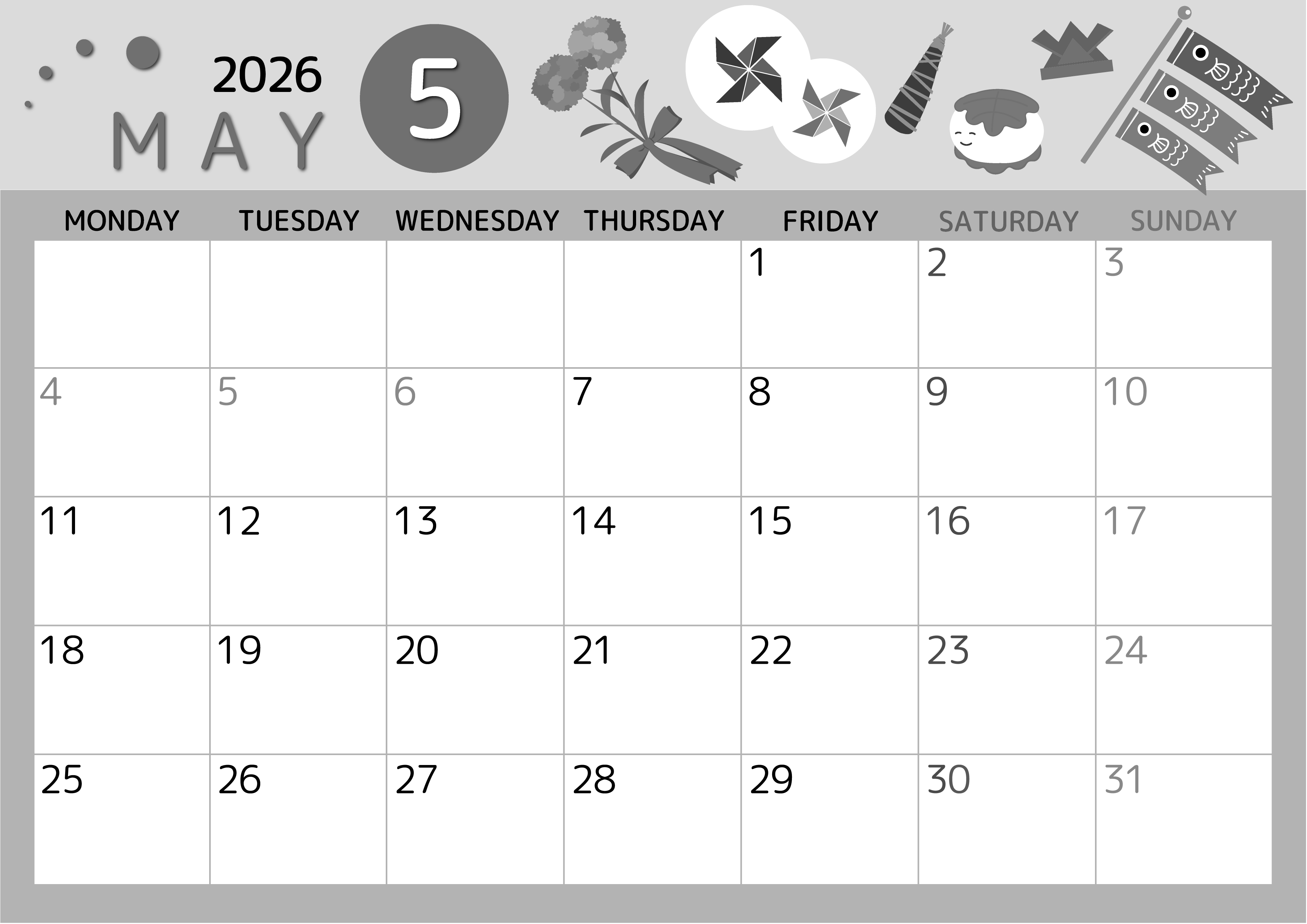 2026年5月横型モノクロの月曜始まりの無料テンプレート白黒カレンダーです。月曜始まりでイベントの予定を簡易するのに適している白黒カレンダーです。イラストも派手過ぎずかわいいのでスケジュールを書き込みやすいです。(2026-00340501)