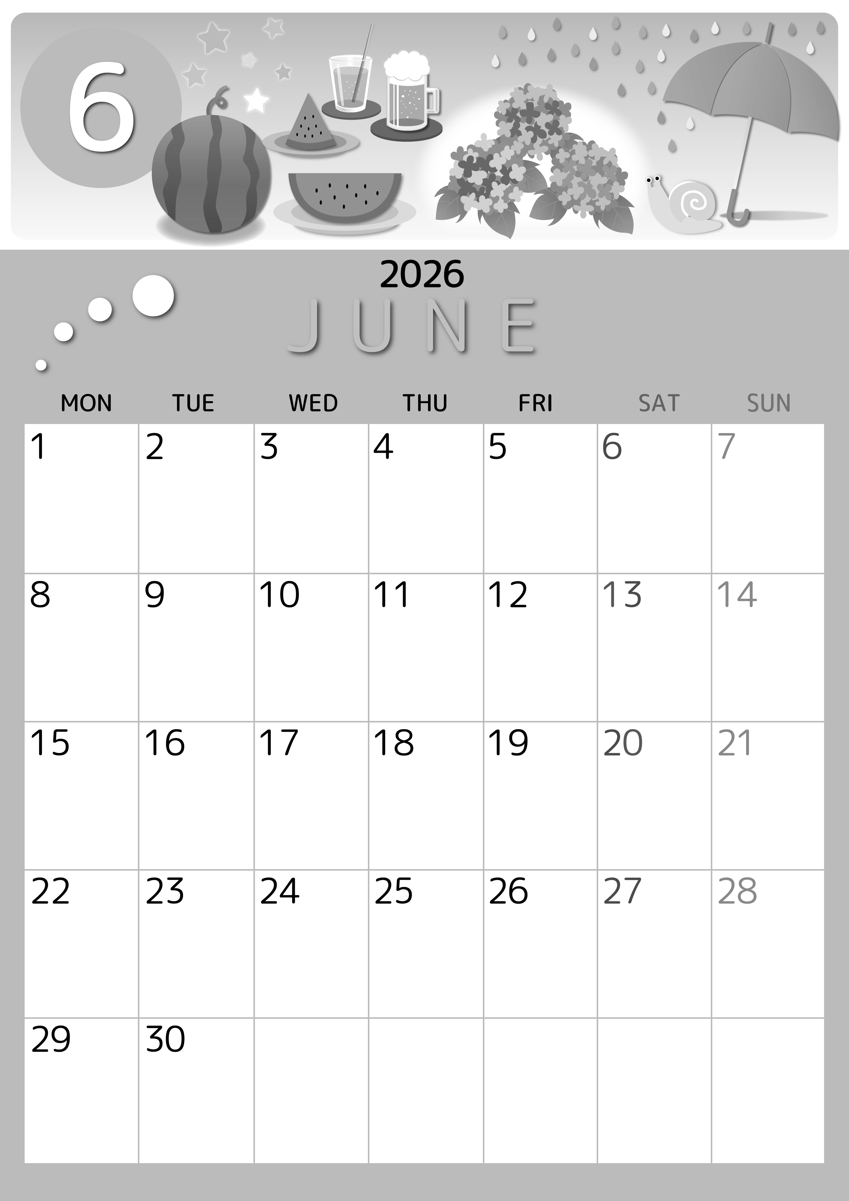 2026年6月縦型モノクロの月曜始まりの無料テンプレート白黒カレンダーです。黄色のフレームに囲まれていてスケジュールを記入する欄は白くて使いやすい月曜始まりの白黒カレンダーです。イラストもすいかがかわいい夏らしい素材です。(2026-00340611)