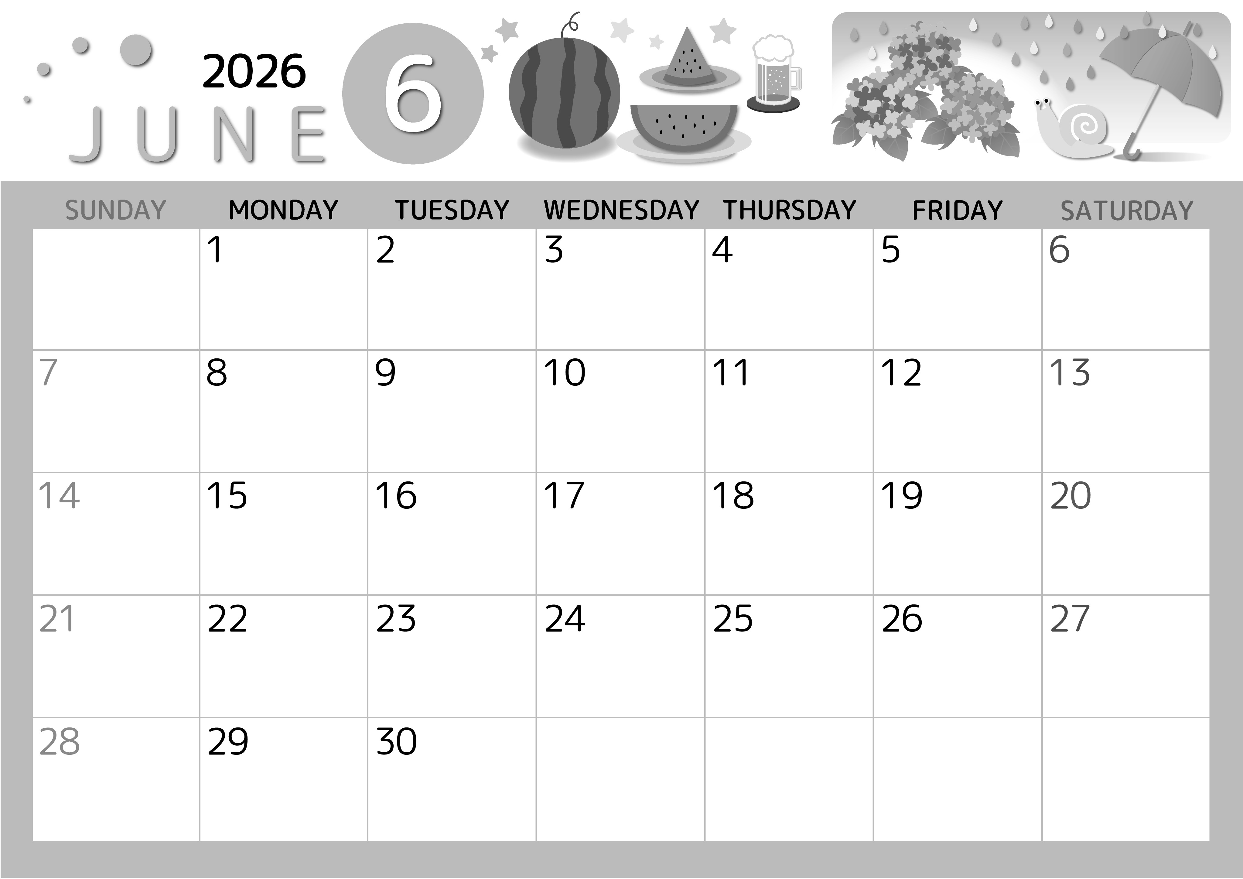 2026年6月横型モノクロの日曜始まりの無料テンプレート白黒カレンダーです。すいかとビールがおいしそうで飲食したくなるようなかわいいイラストの白黒カレンダーです。いろいろなアイテムがちりばめられているのでキュートです。(2026-00340600)