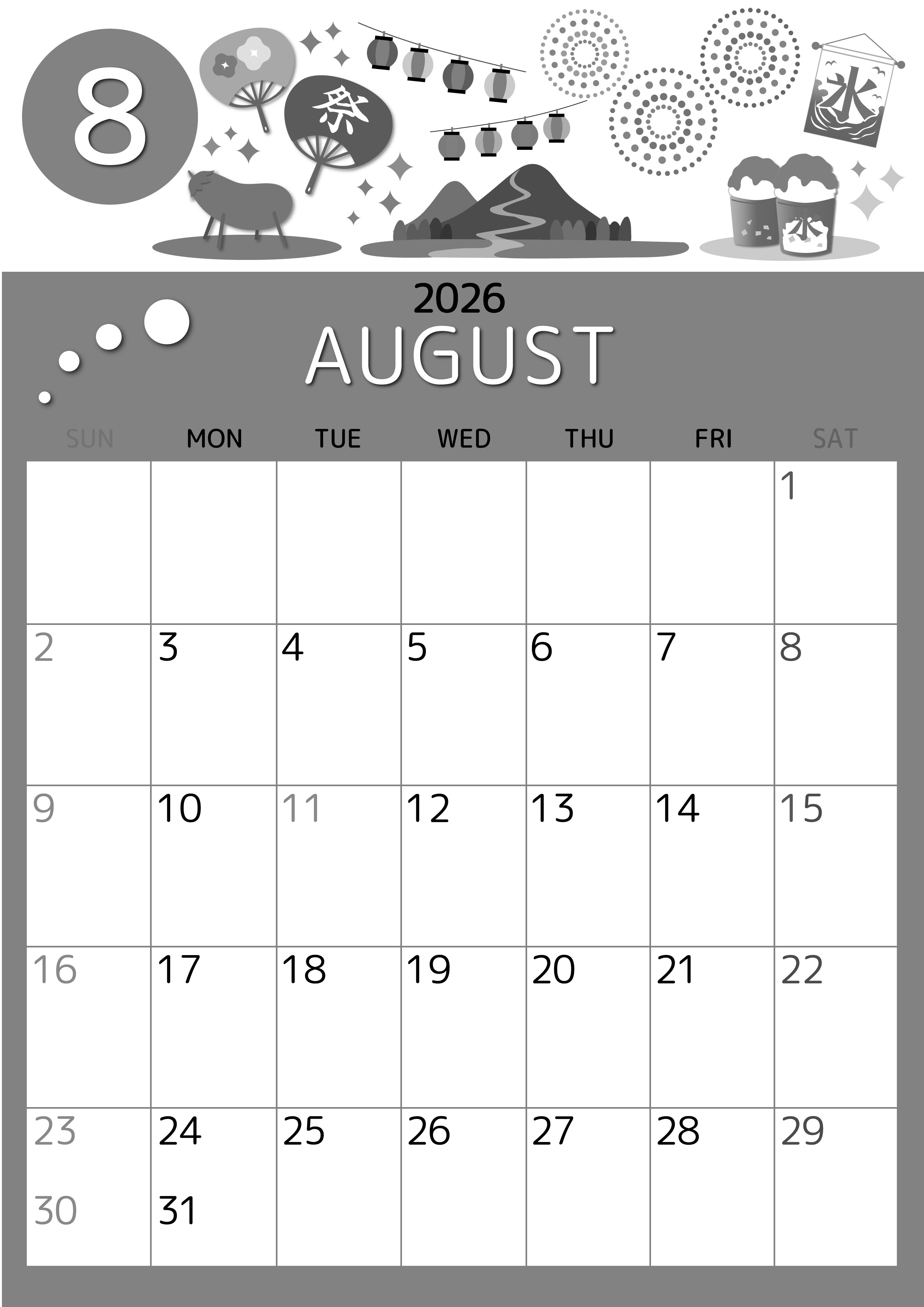 2026年8月縦型モノクロの日曜始まりの無料テンプレート白黒カレンダーです。夏祭りに欠かせないいろいろなアイテムをかわいいテイストで描いたイラスト白黒カレンダーです。縦型なので壁に貼って予定をチェックしやすいです。(2026-00340810)