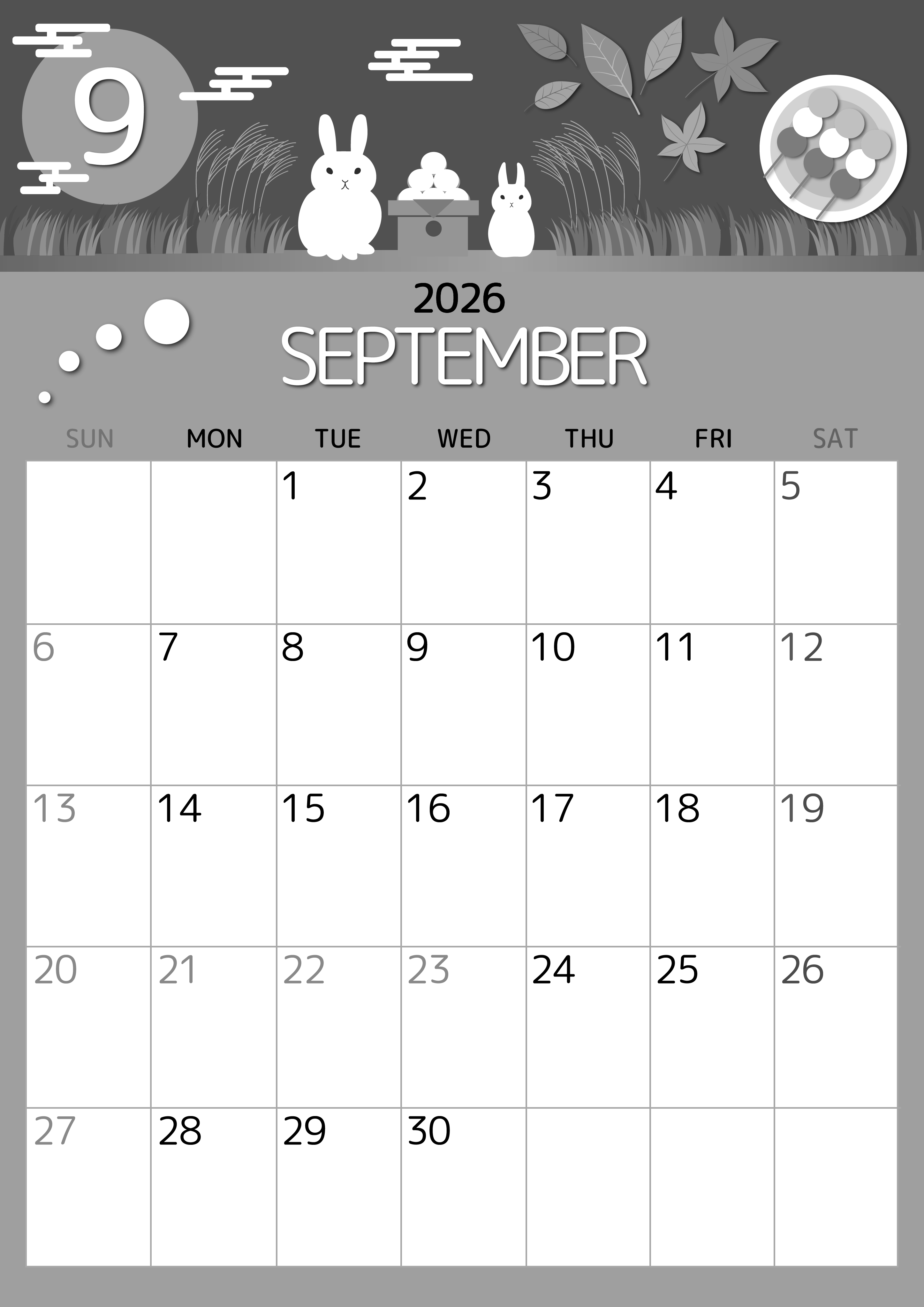 2026年9月縦型モノクロの日曜始まりの無料テンプレート白黒カレンダーです。文字が細いフォントなのでスッキリとして見やすいデザインです。イラスト部分は十五夜を題材にしていてかわいいポップな調子です。(2026-00340910)