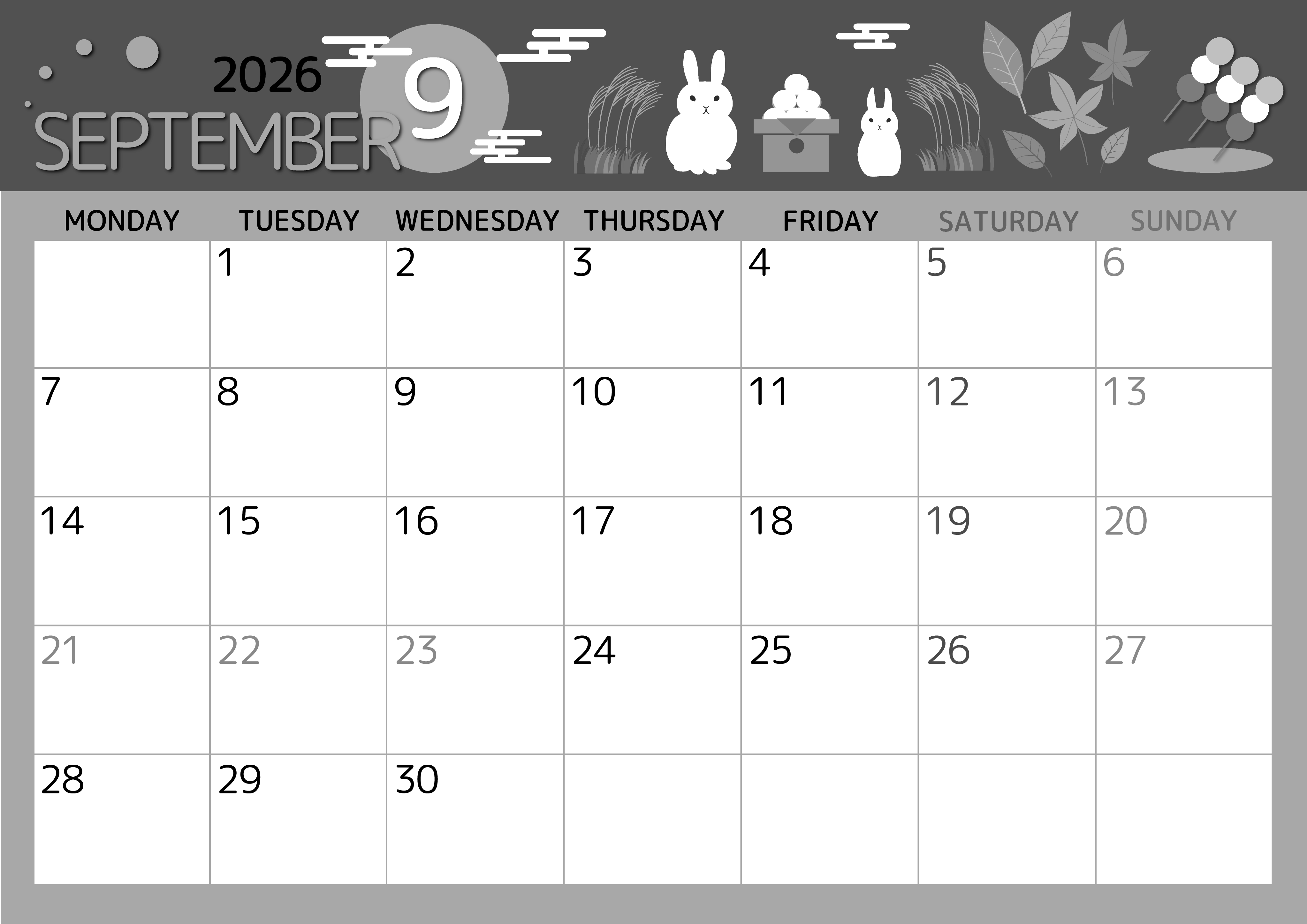 2026年9月横型モノクロの月曜始まりの無料テンプレート白黒カレンダーです。十五夜をテーマにしたイラストがふんだんに描かれています。うさぎさんがかわいいです。三色団子や紅葉やススキや満月も目を引くポイントです。(2026-00340901)