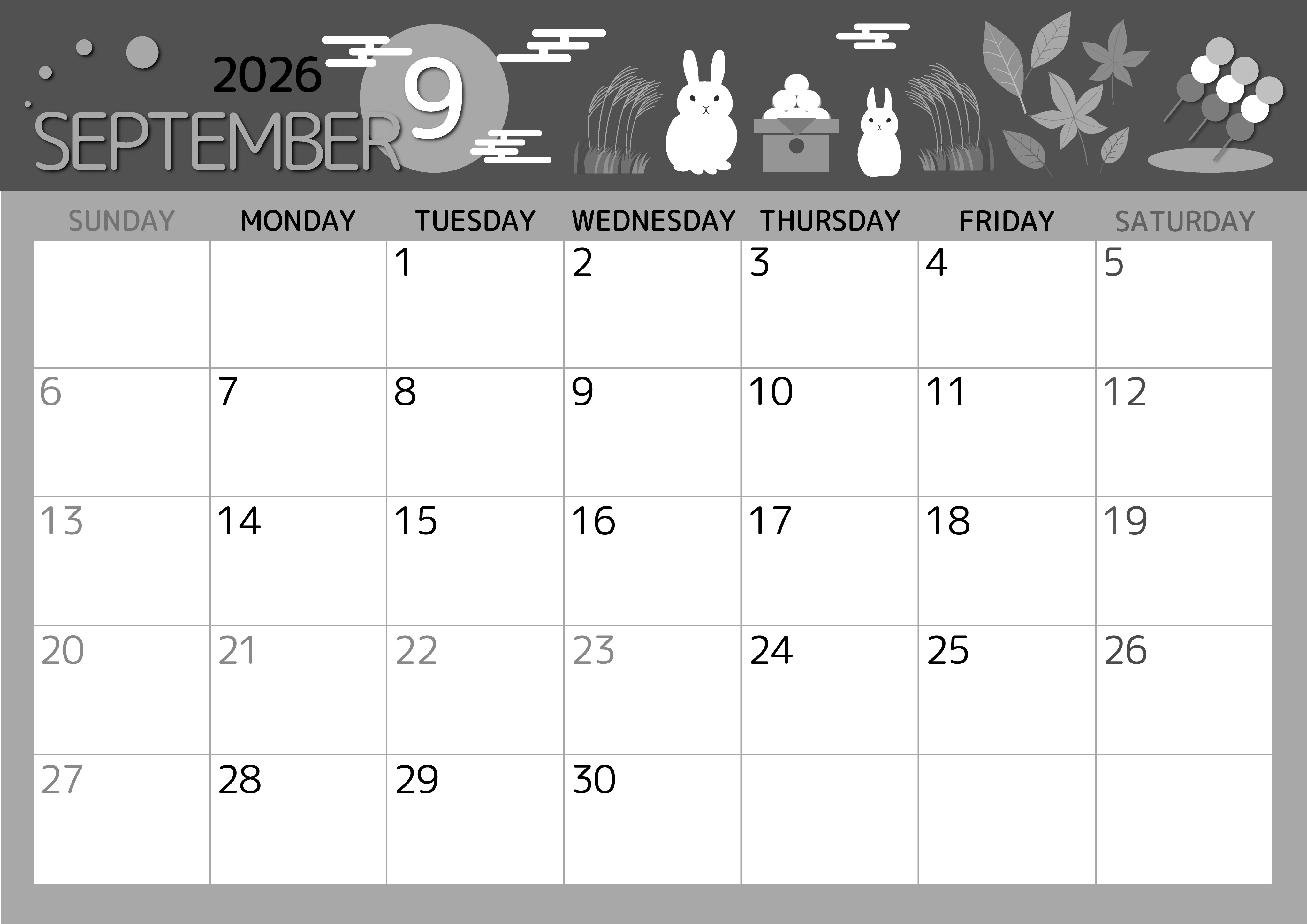 2026年9月横型モノクロの日曜始まりの無料テンプレート白黒カレンダーです。十五夜の様子を非常に賑やかに細かく書き上げたかわいいイラストに白黒カレンダー部分をフレーミングしたとてもかわいいデザインです。(2026-00340900)