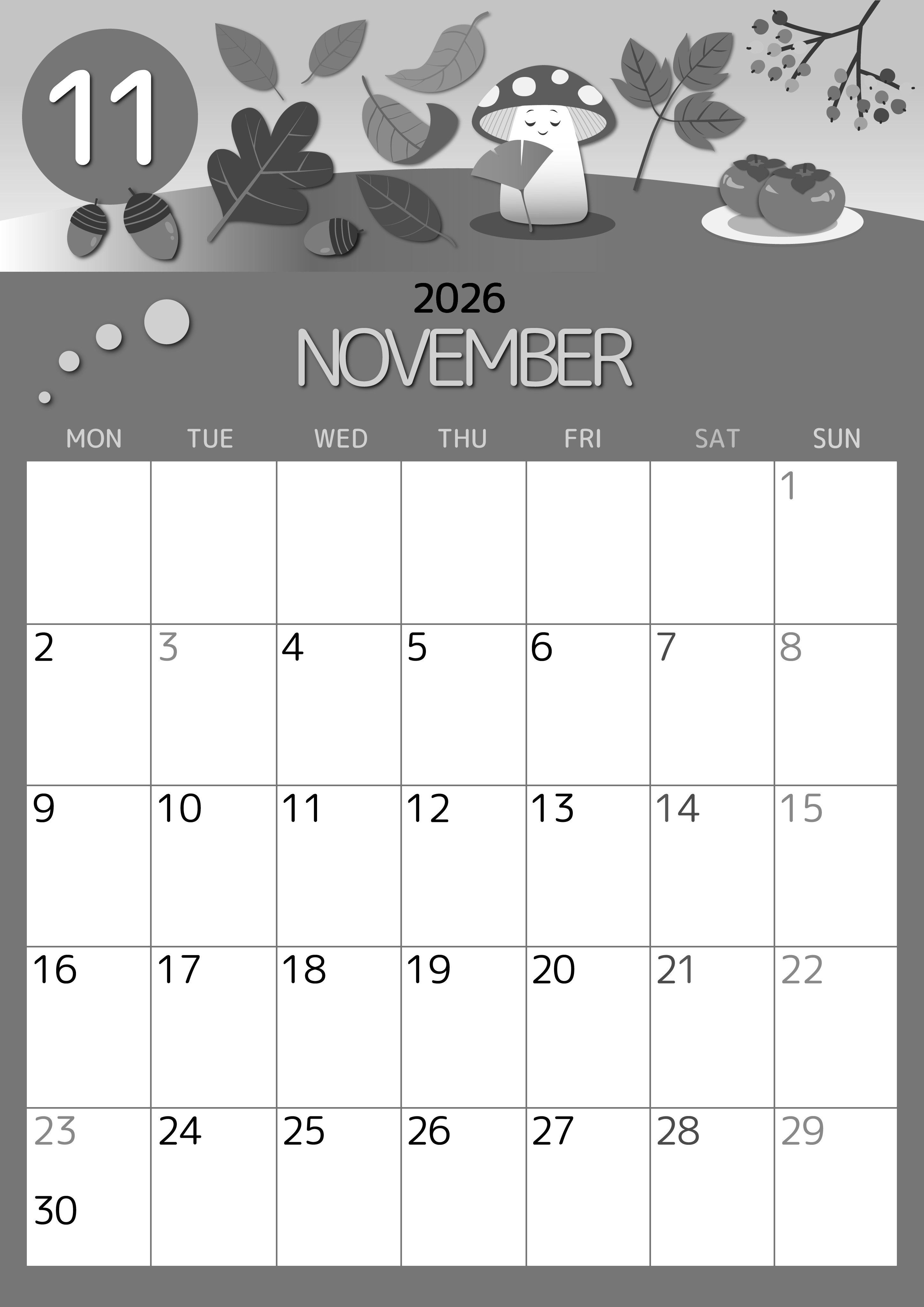 2026年・無料のカレンダーテンプレート 2026年11月縦型モノクロの月曜始まり きのこイラストのかわいいA4無料白黒カレンダー(2026-00341111) 素材状デザイン王 2025年4月1日 2026年11月縦型モノクロの月曜始まりの無料テンプレート白黒カレンダーです。数字が丸っこくて細い線なので騒がしくなく見やすいです。きのこのイラストがワンポイントでかわいいのでおすすめです。(2026-00341111) 11月 縦型のカレンダー 月曜始まり 白黒 カレンダーデザイン-0034