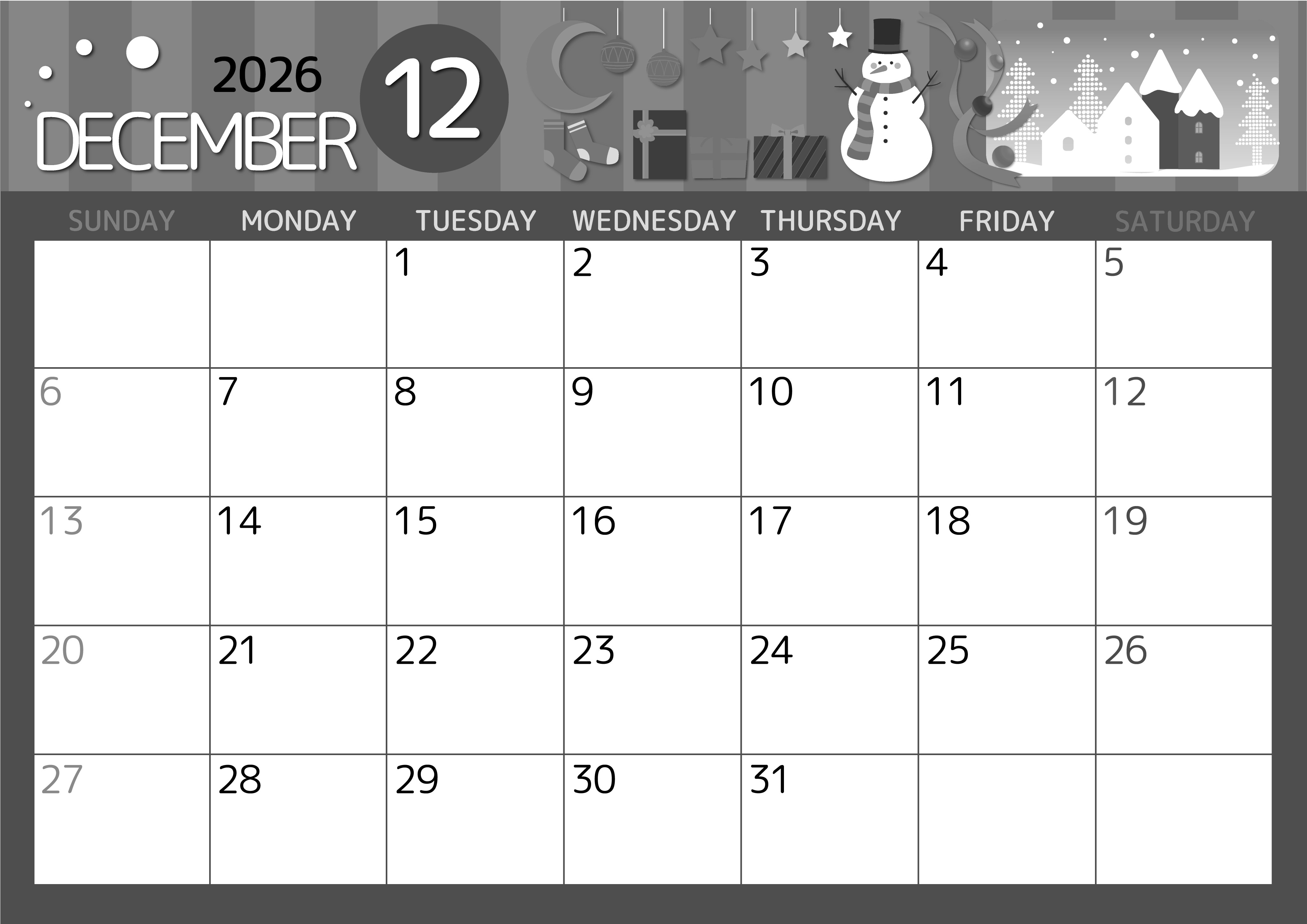 2026年12月横型モノクロの日曜始まり 雪だるまイラストのかわいいA4無料白黒カレンダー(2026-00341200)