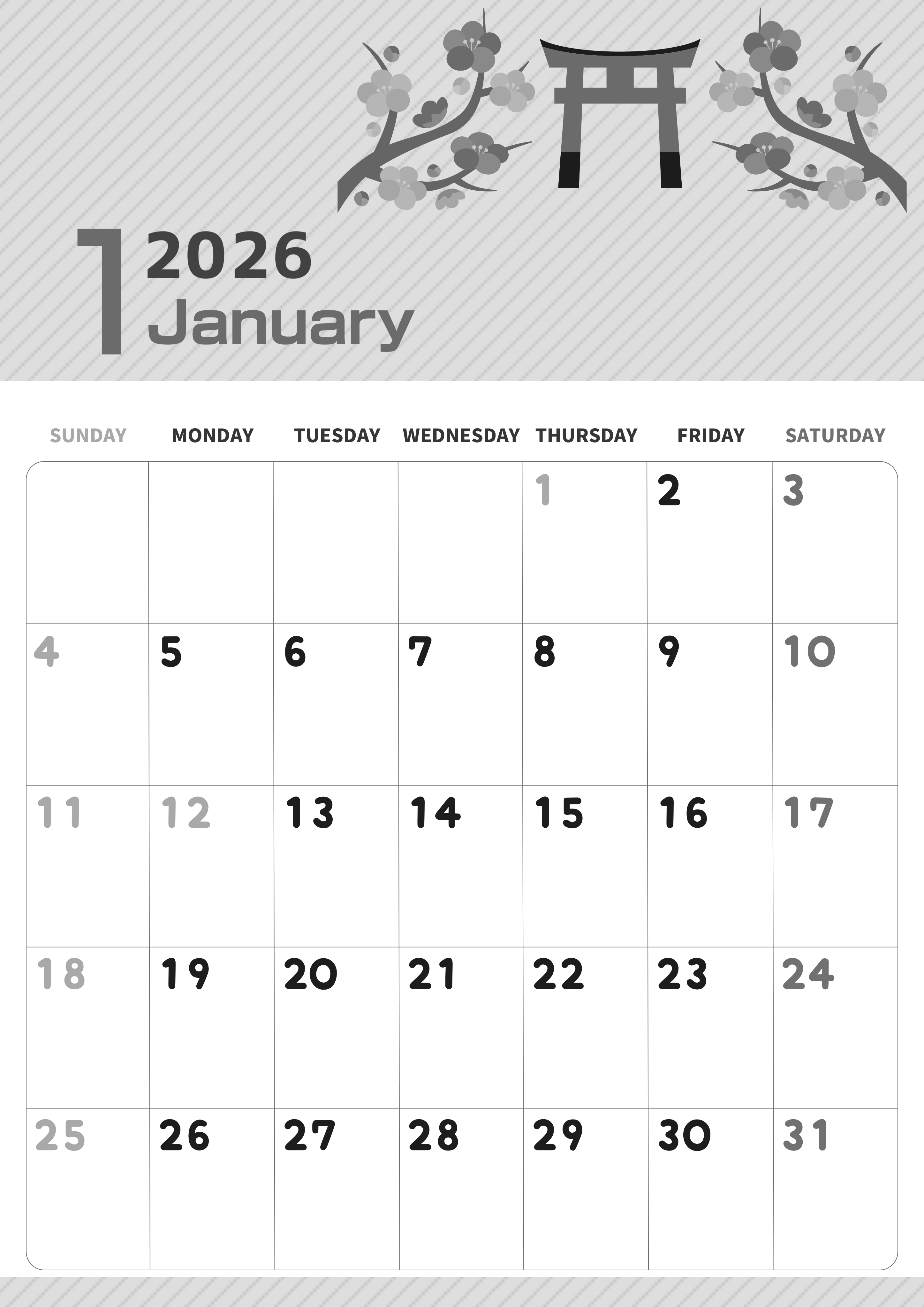 2026年1月縦型モノクロの日曜始まり白黒カレンダーです。中心に鳥居をどっしりと構えていてその両側ににょきにょきと梅の花が生き生きと生えて生命の力強さを感じさせるかわいいイラストで気持ちも明るくなれるような白黒カレンダーです。背景はうっすらストライプです。(2026-00350110)