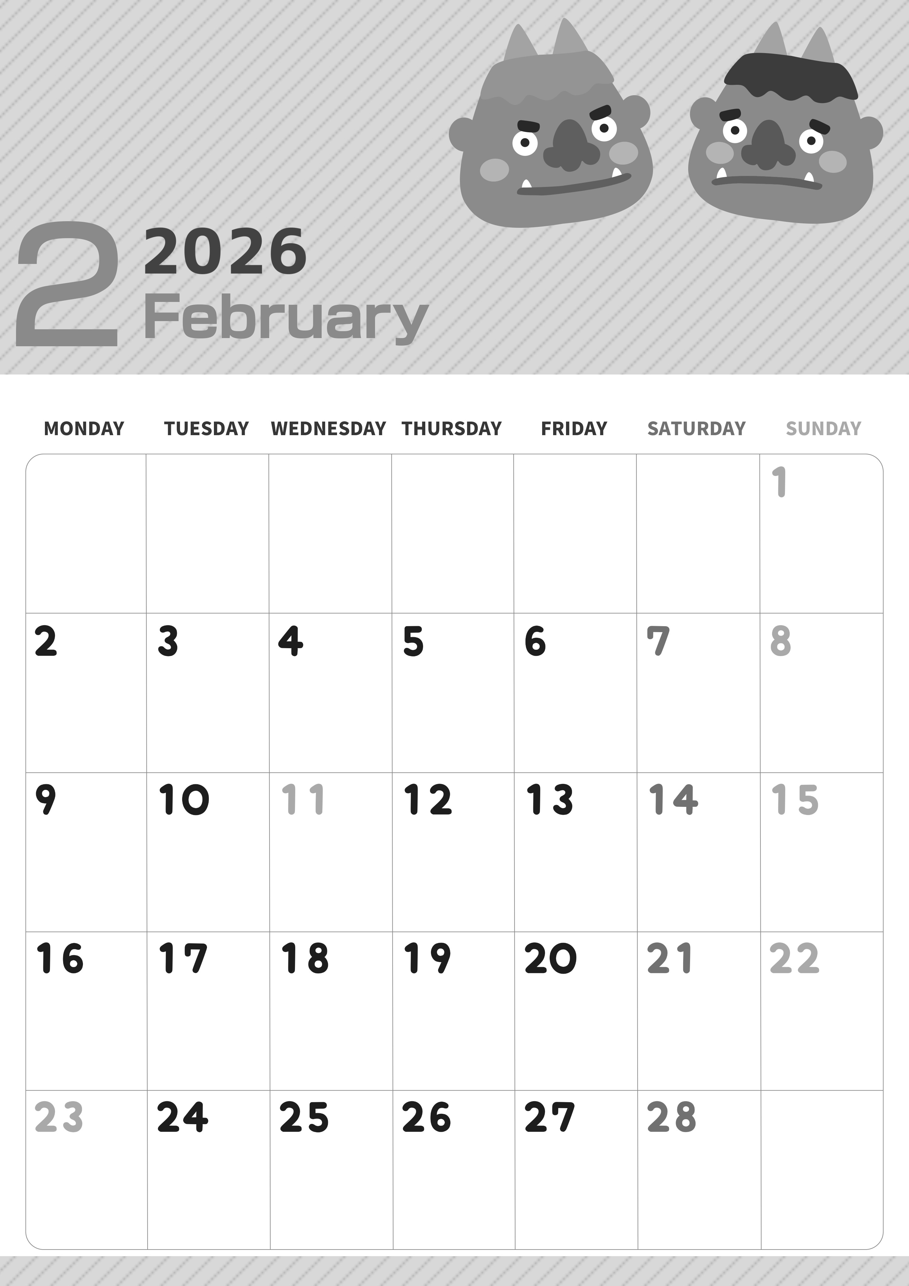2026年2月縦型モノクロの月曜始まり 鬼カップルがかわいいイラストA4無料白黒カレンダー(2026-00350211)