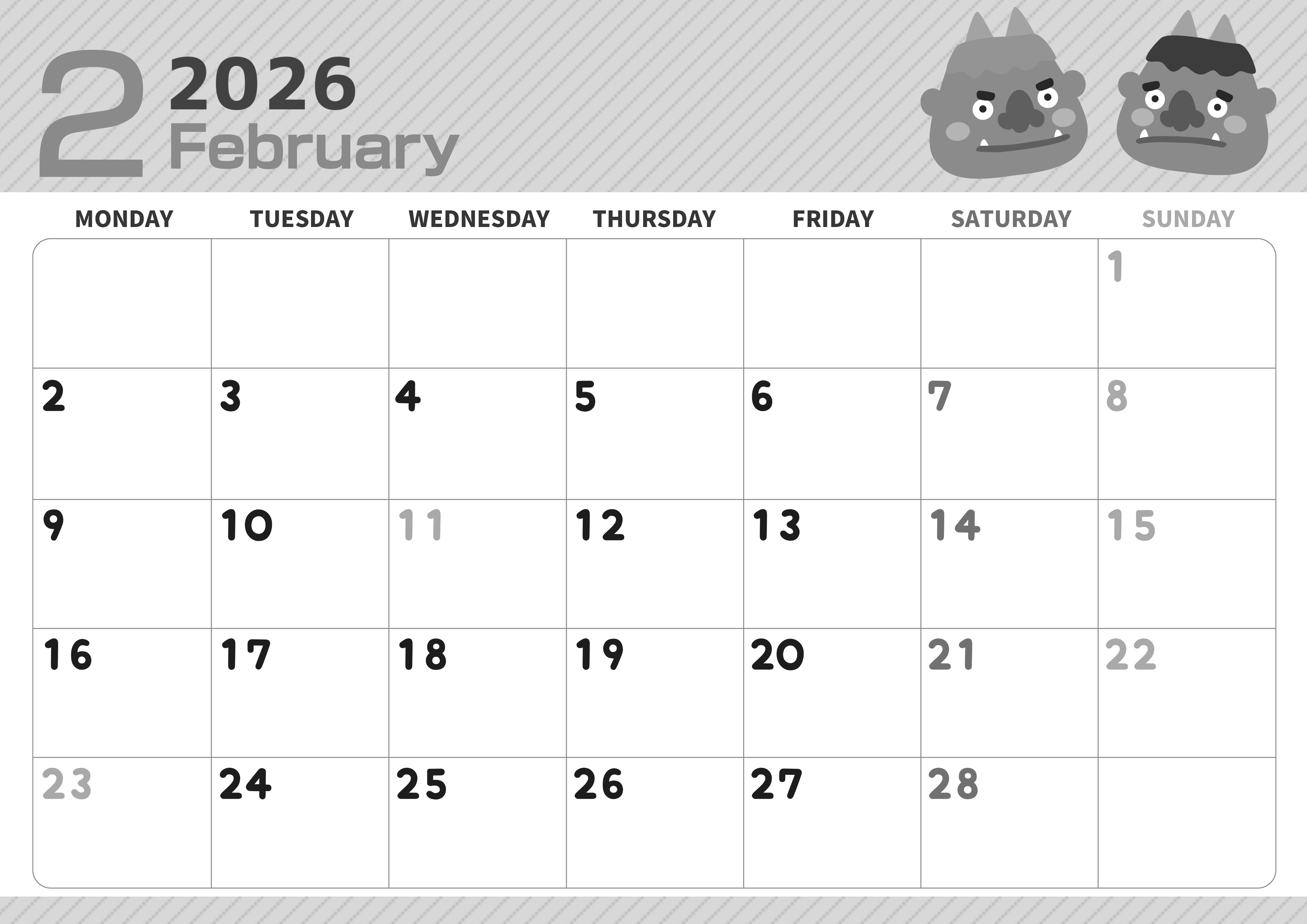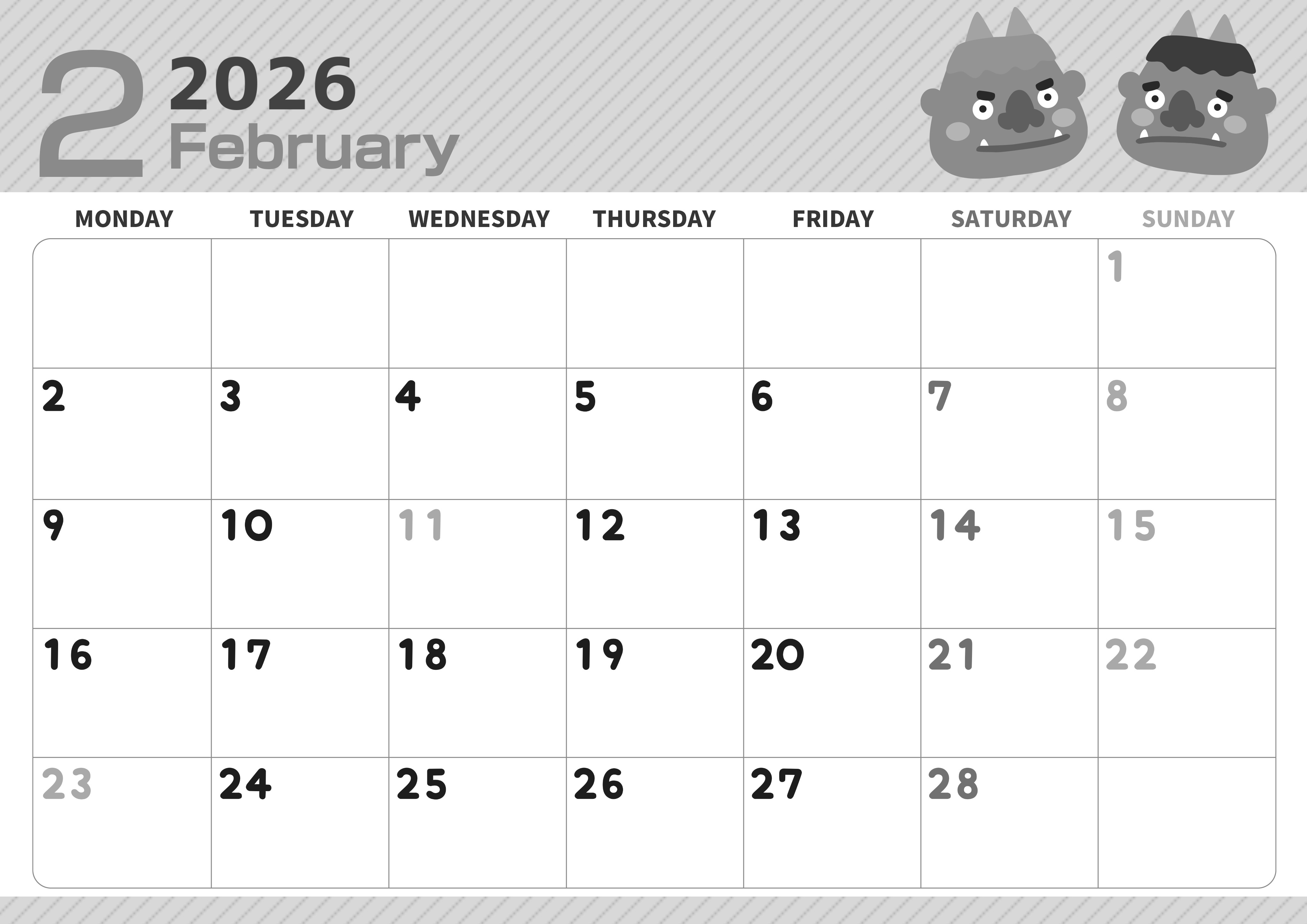 2026年2月横型モノクロの月曜始まりの無料テンプレート白黒カレンダーです。曜日によって色分けされた文字が予定のプランニングをよりスムーズにしてくれる効率化に適したかわいい白黒カレンダー素材となっています。(2026-00350201)