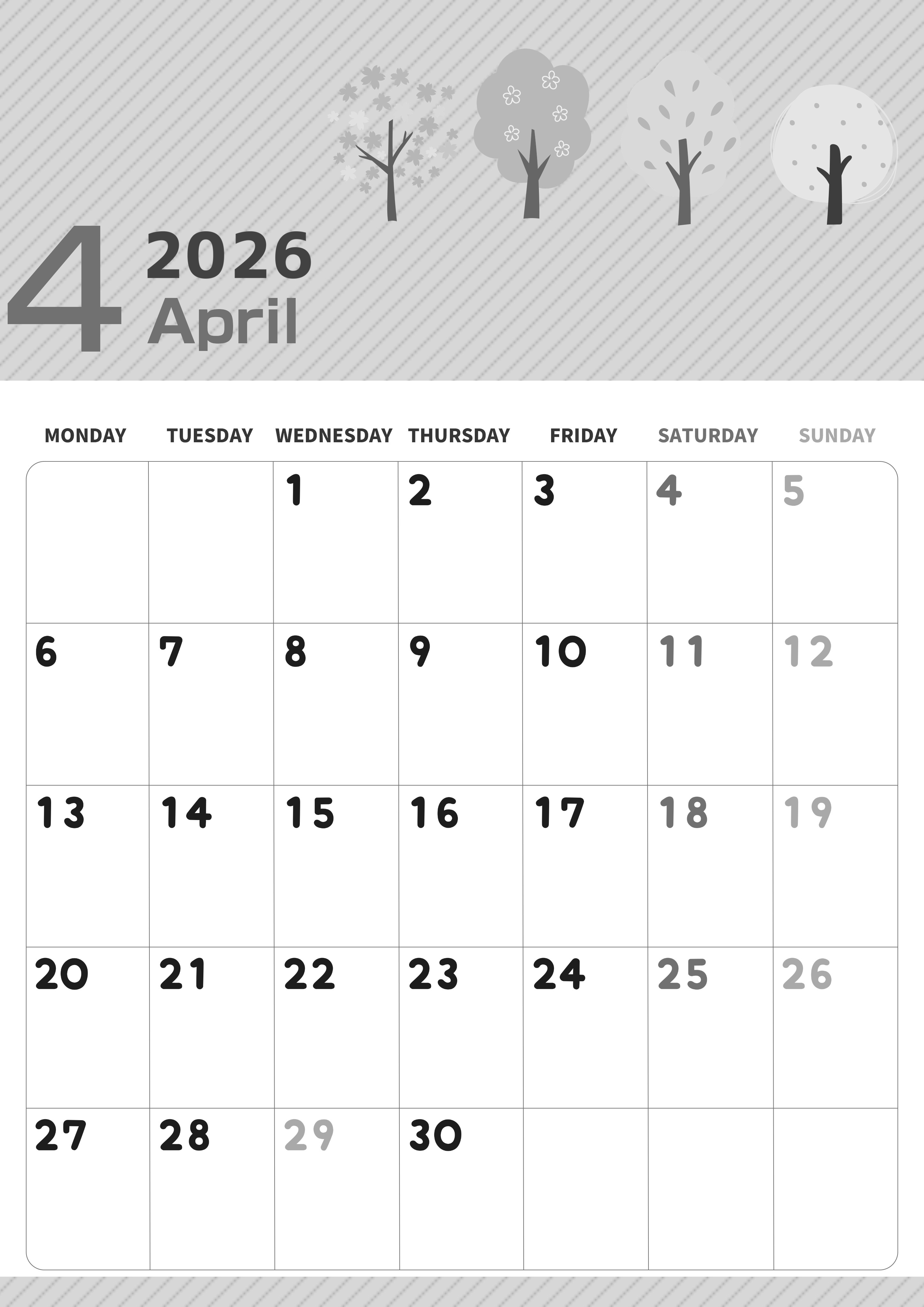2026年4月縦型モノクロの月曜始まりの無料テンプレート白黒カレンダーです。桜木に春を感じさせるかわいいイラストがチャームポイントの見やすい白黒カレンダーです。新生活の計画立てにお使い下さい。(2026-00350411)