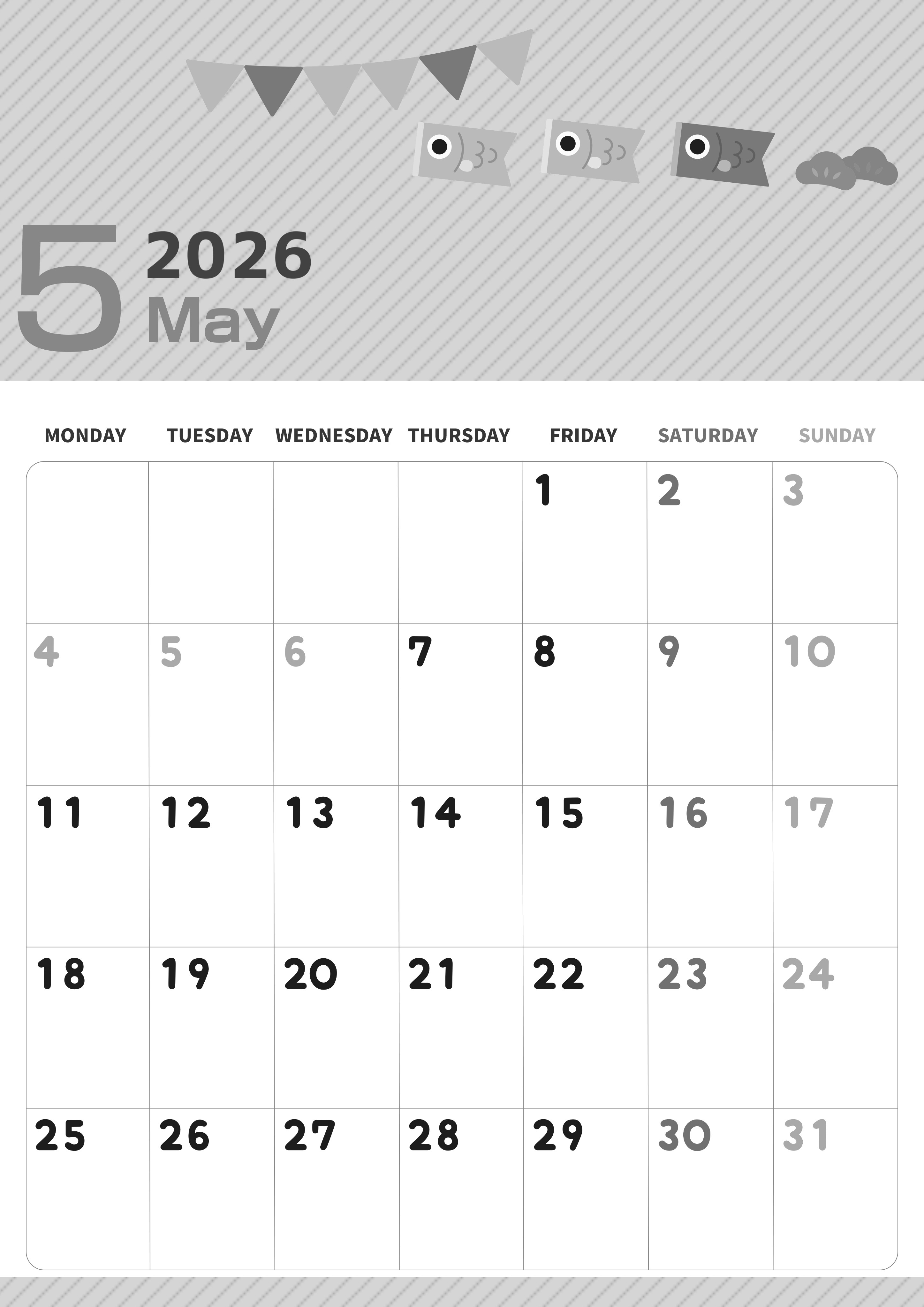 2026年5月縦型モノクロの月曜始まりの無料テンプレート白黒カレンダーです。スプライトの背景に鯉のぼりのイラストがポンとかわいい白黒カレンダーです。月曜始まりで曜日が色分けされているので見やすいです。(2026-00350511)