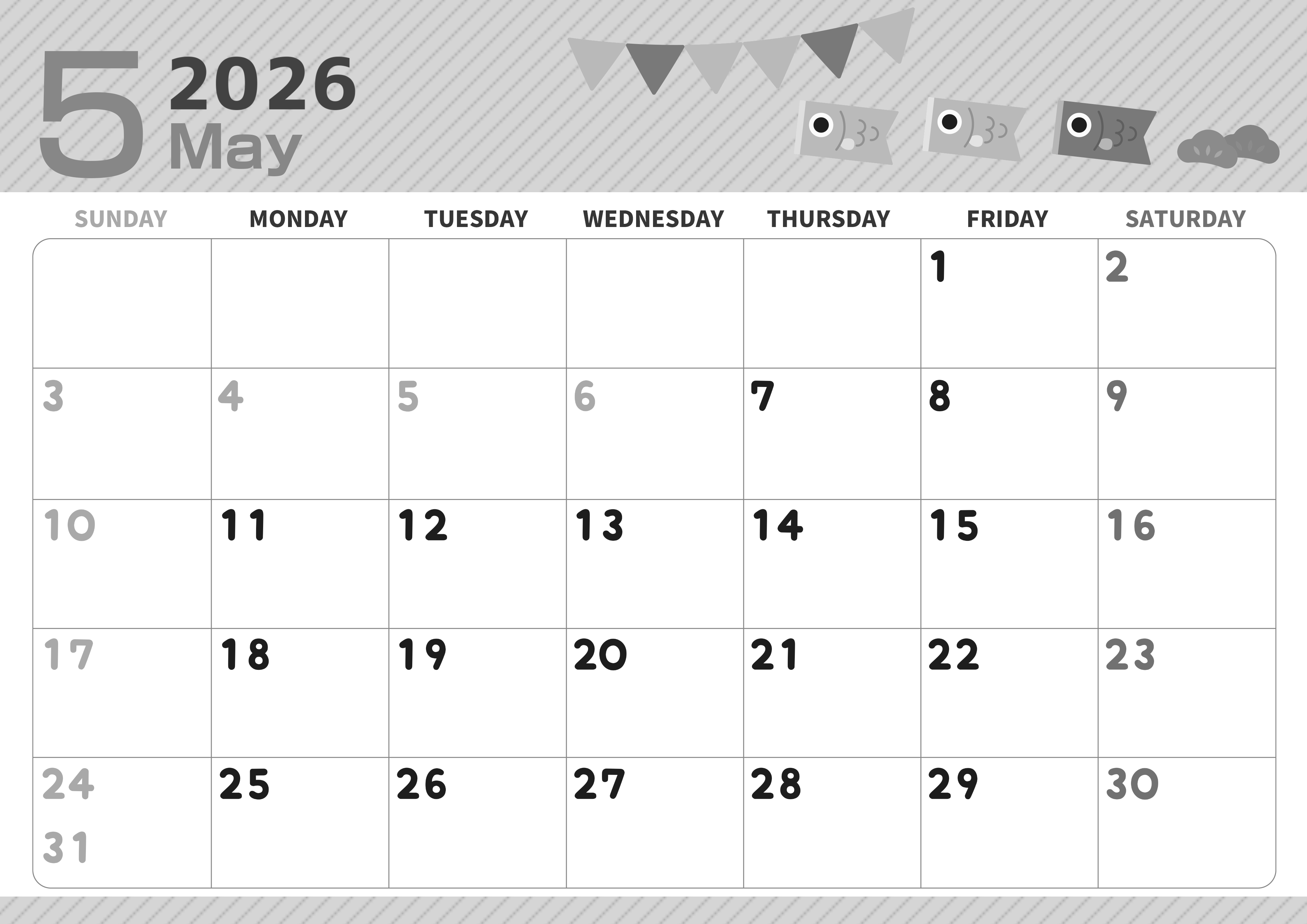 2026年5月横型モノクロの日曜始まりの無料テンプレート白黒カレンダーです。ほのぼのとしたテイストで鯉のぼりが描かれているかわいい癒し系のイラスト白黒カレンダーです。大きめの余白がたっぷり確保されているので予定を記入しやすいです。(2026-00350500)