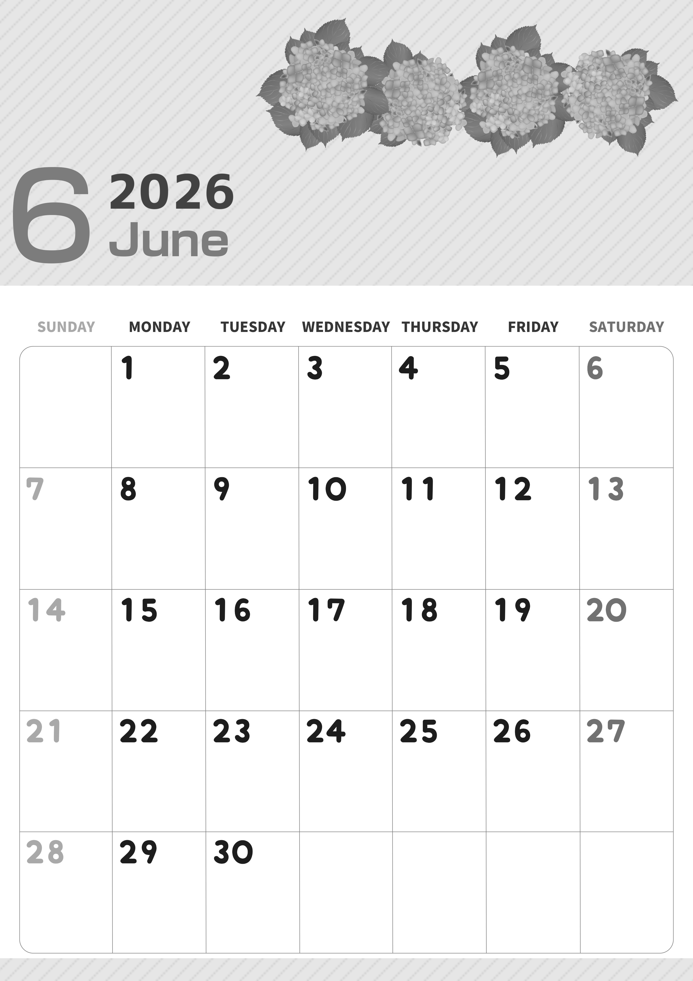 2026年6月縦型モノクロの日曜始まりの無料テンプレート白黒カレンダーです。季節の花の代表であるアジサイのイラストがしっとりとかわいいフリー素材の白黒カレンダーです。曜日ごとに文字が色分けされていて充実しています。(2026-00350610)