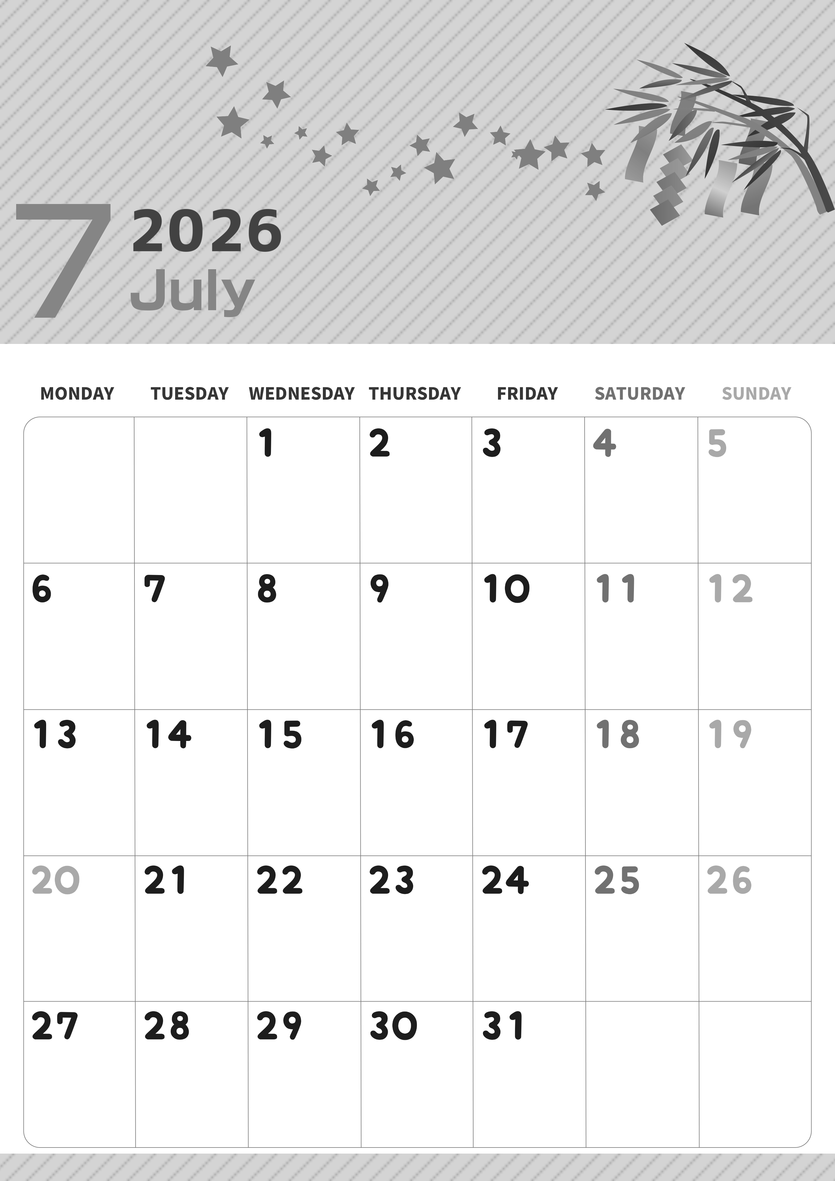 2026年7月縦型モノクロの月曜始まりの無料テンプレート白黒カレンダーです。月曜始まりで手書きがしやすい無料ダウンロードが簡単に行える白黒カレンダー素材です。イラストのテーマは天の川で七夕の行事を連想させてくれます。(2026-00350711)